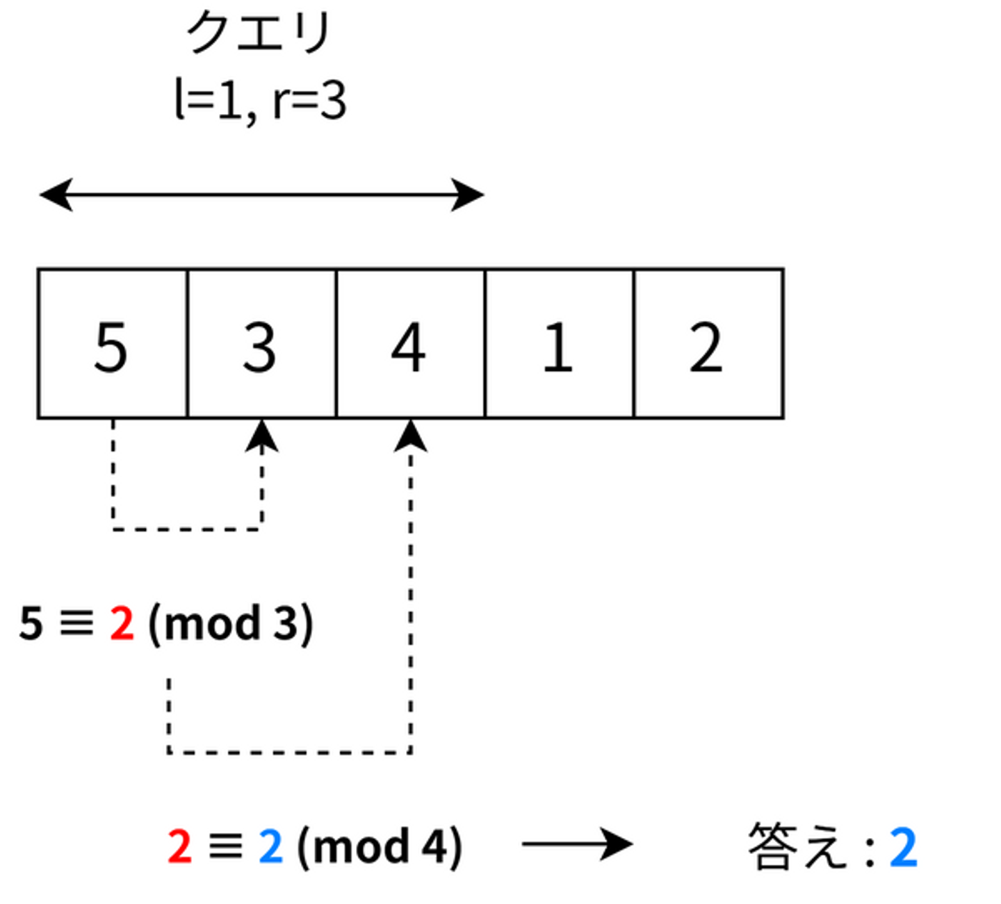正整数列 A に対して区間 l, r がクエリとして Q 個与えられるので、A の l 番目の要素に対して l+1, l+2, ... r 番目の要素で割ったあまりを順に計算し、その結果を答えるという問題です。