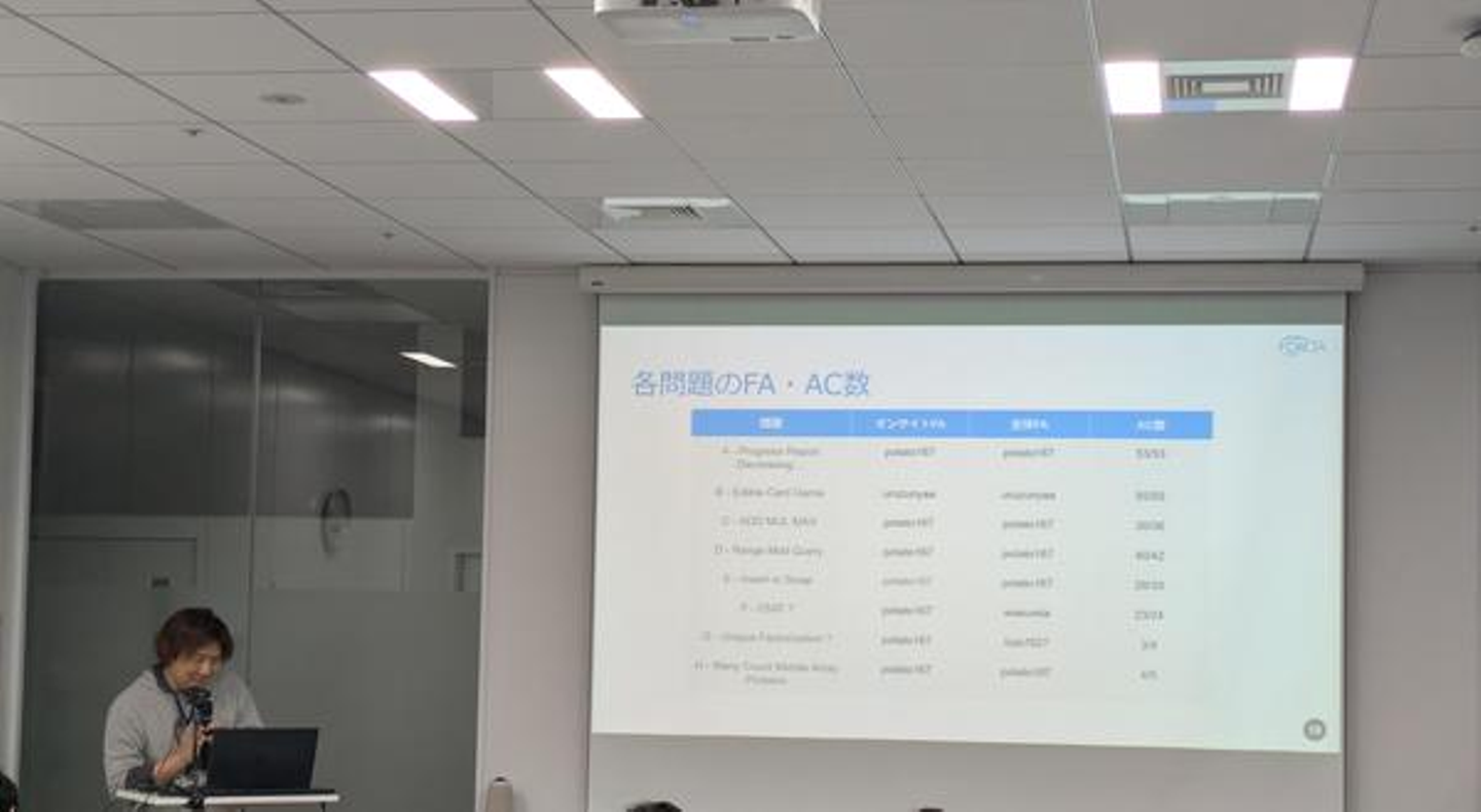 前回に引き続き、今回もコンテストの作問作業の進行管理を担当しました。試行錯誤しながら問題を準備し、競プロ部員と議論しながら一つのコンテストを作り上げるのは一筋縄ではいかず苦労することも多いです。しかしその分、参加者の感想や懇親会で楽しんでいただけている様子を見ると非常に達成感があります。