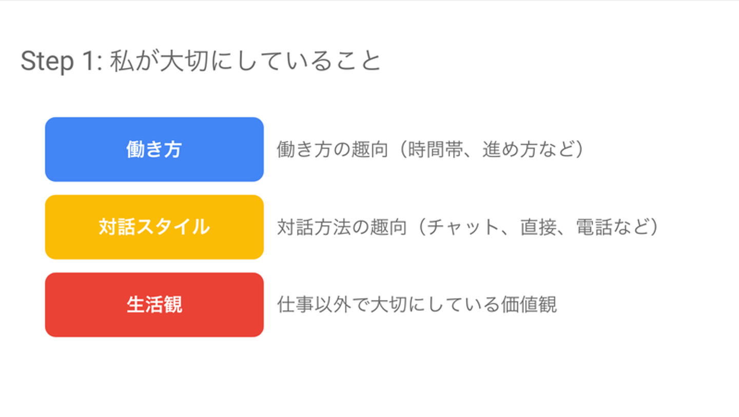 【働き方】 働き方の趣向(時間帯、進め方など)【対話スタイル】 対話方法の趣向(チャット、対面、電話など)【生活観】 仕事以外で大切にしている価値観
