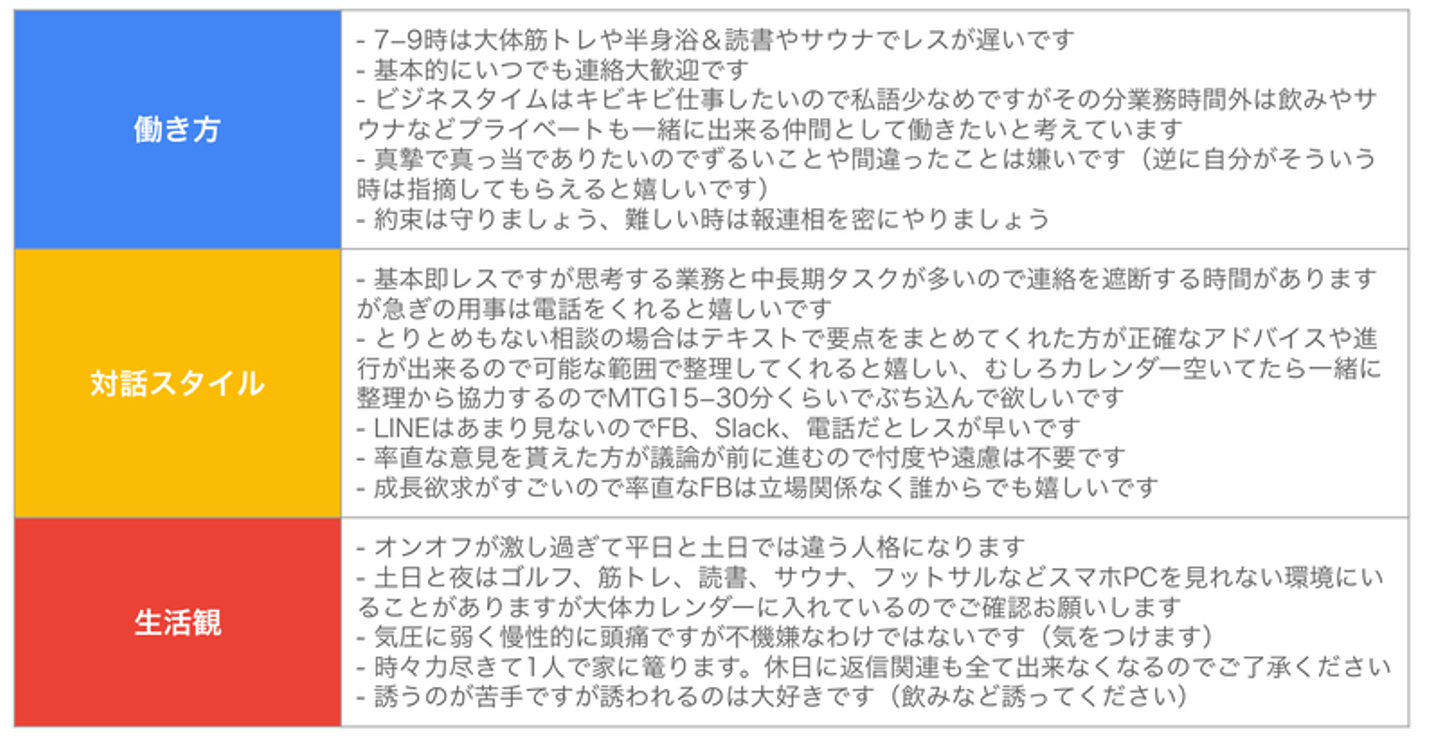 ・基本即レスですが思考する業務と中長期タスクが多いので連絡を遮断する時間がありますが急ぎの用事は電話をくれると嬉しいです・とりとめもない相談の場合はテキストで要点をまとめてくれた方が正確なアドバイスや進行が出来るので可能な範囲で整理してくれると嬉しい、むしろカレンダー空いてたら一緒に整理から協力するのでMTG15−30分くらいでぶち込んで欲しいです・LINEはあまり見ないのでFB、Slack、電話だとレスが早いです・率直な意見を貰えた方が議論が前に進むので忖度や遠慮は不要です・成長欲求がすごいので率直なFBは立場関係なく誰からでも嬉しいです