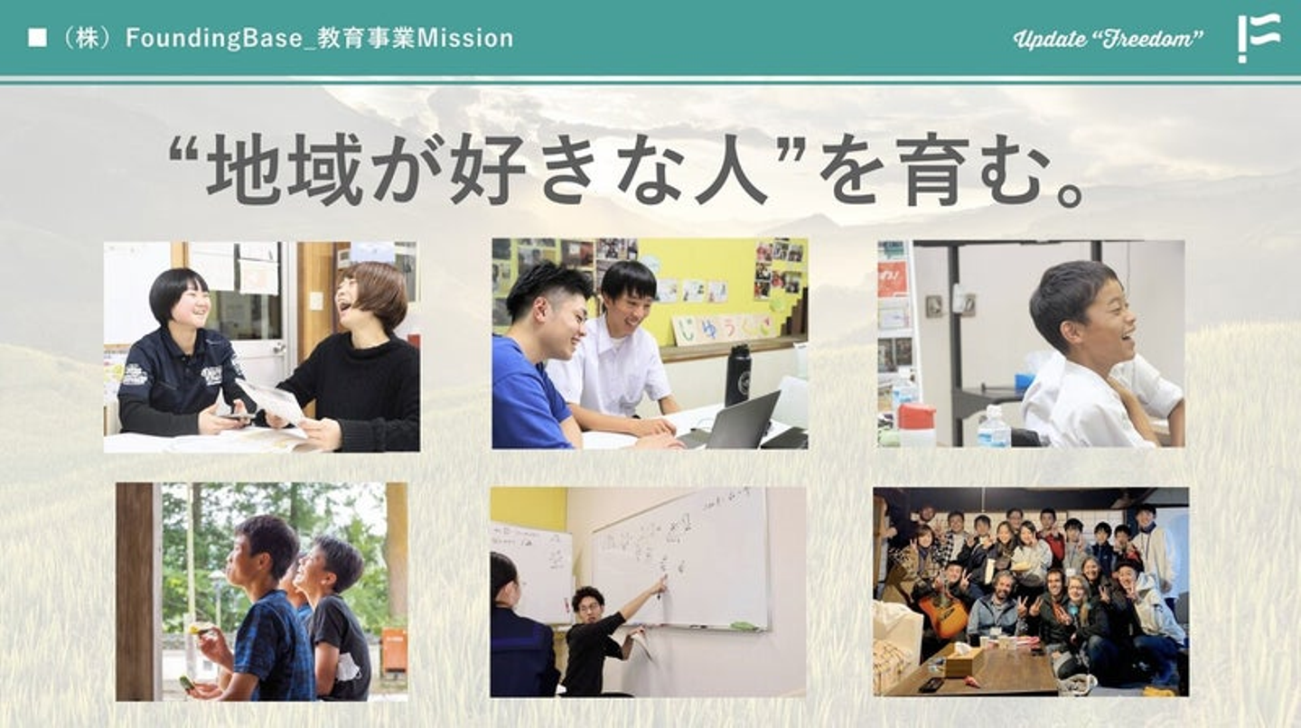 地域を舞台に展開するFoundingBaseの教育事業は、「地域が好きな人を育む」というミッションを掲げています。
