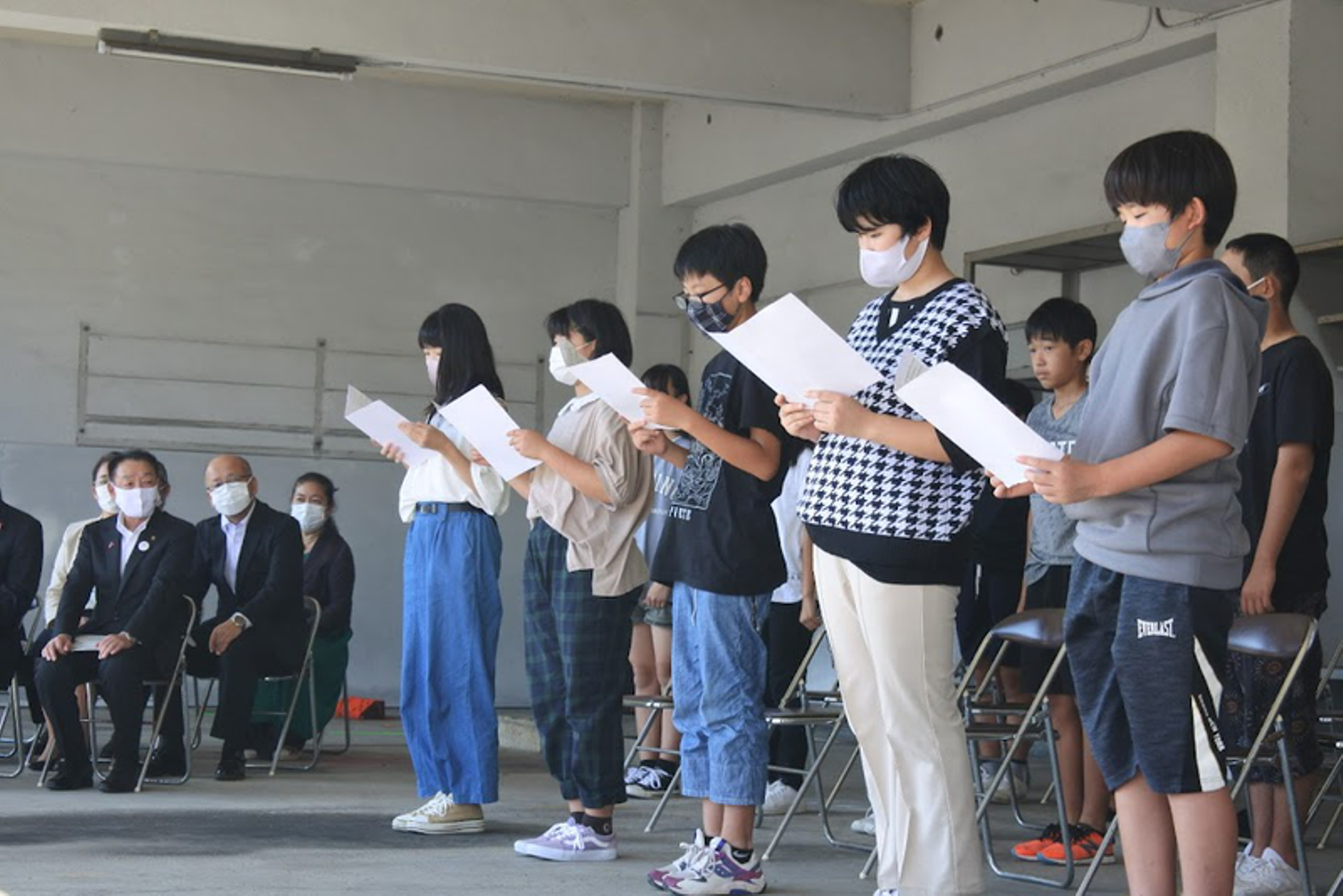 コロナ禍で延期になってしまったオープニングセレモニーですが、晴天の秋空の下、大勢の来賓の方々に見守られ、無事にセレモニーを開催することができました。セレモニーの最後にはminetoの生徒と一緒に考えたロゴのお披露目会もありました。代表でロゴのプレゼンテーターを務めたのは立候補で集まった5名の生徒です。