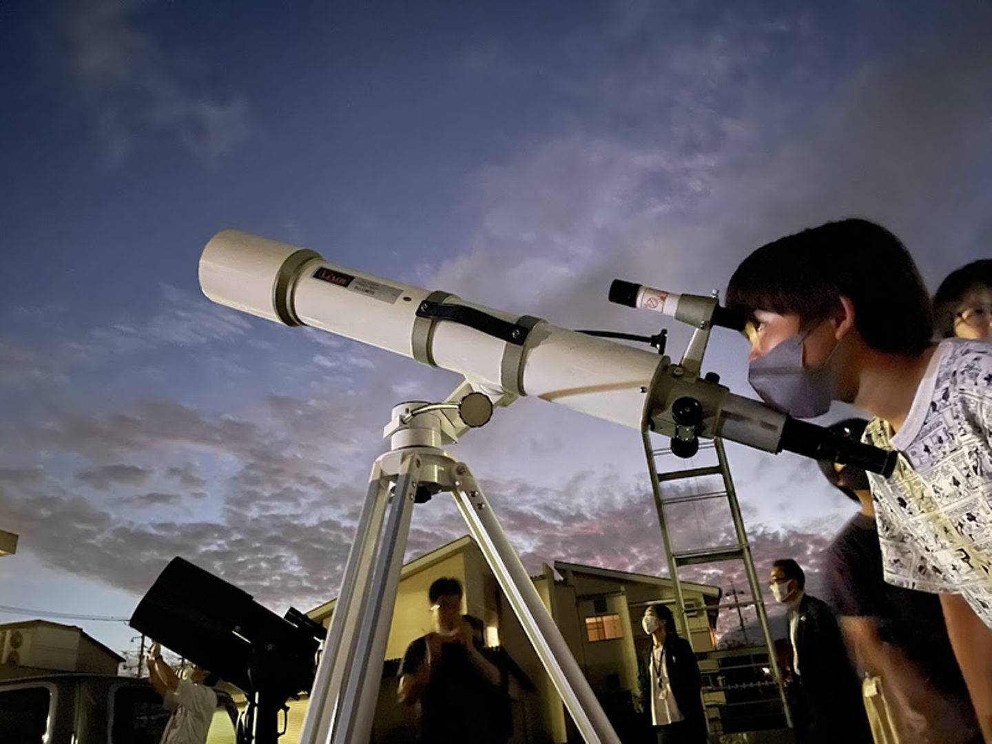 独特の語り口で語られる果てしない宇宙の世界に、ぐいぐい惹き込まれる生徒たち。中でも一番盛り上がったのは「天体望遠鏡で星をみよう!」の時間です。もねさんに望遠鏡を持ってきていただいたのですが、高校生の時に自分でお金貯めて買ったという天体望遠鏡、なんと300万円・・・!!その値段に仰天しながらも、一生に二度とない機会であろうこの望遠鏡をお借りして、生徒と一緒に夜空を観察しました。月の表面や土星の輪がくっきりと見え、生徒たちからは「すごい!!」と感嘆の声が挙がっていました。