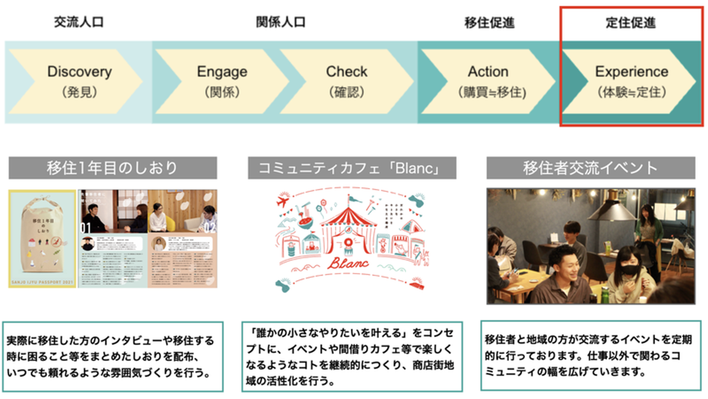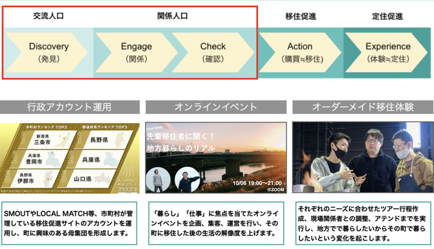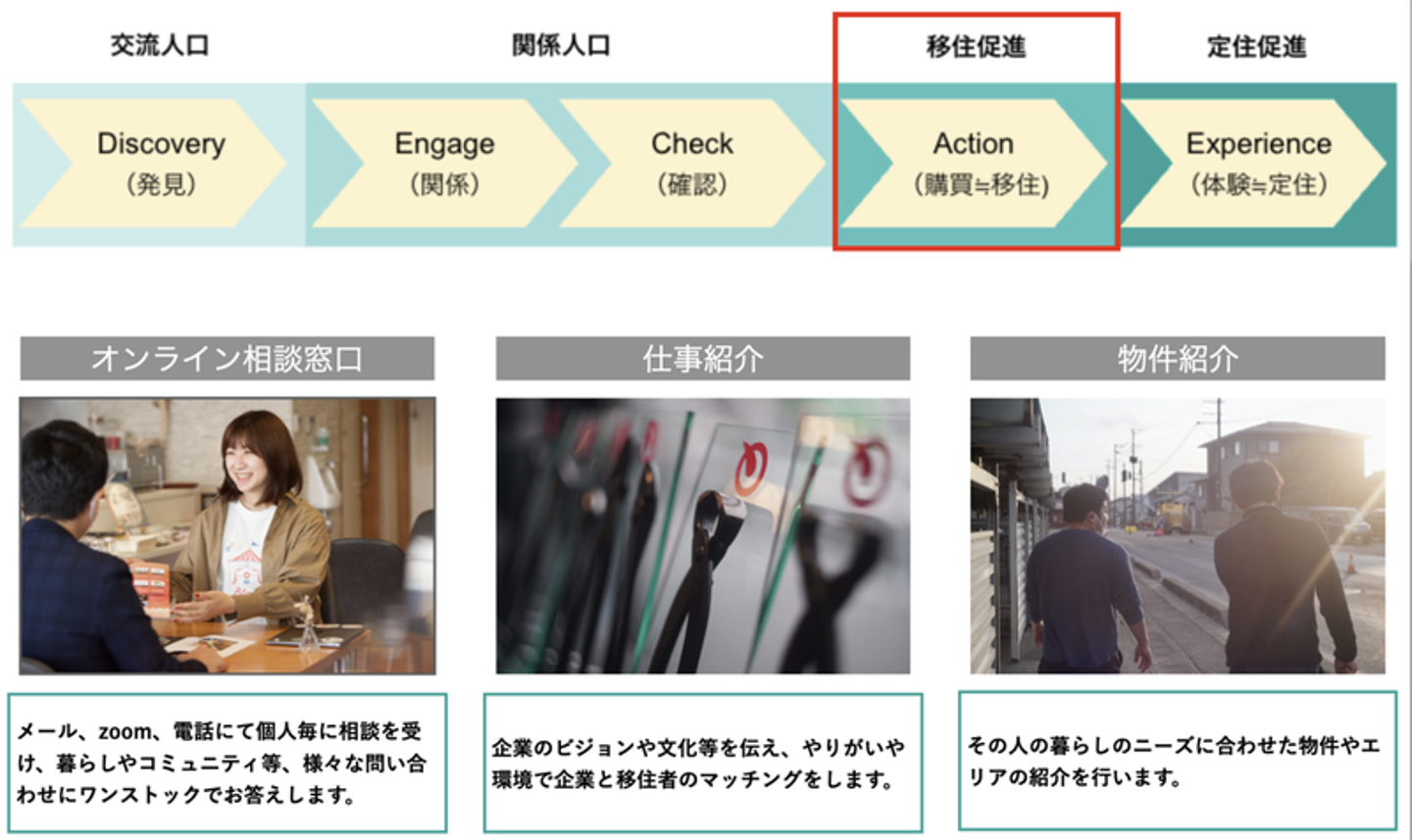 移住を決める時に、その地域の「仕事、暮らし、コミュニティ」での温かさや面白さを知って欲しいという思いから、それぞれのフェーズに合わせたサービス提供を行いました。