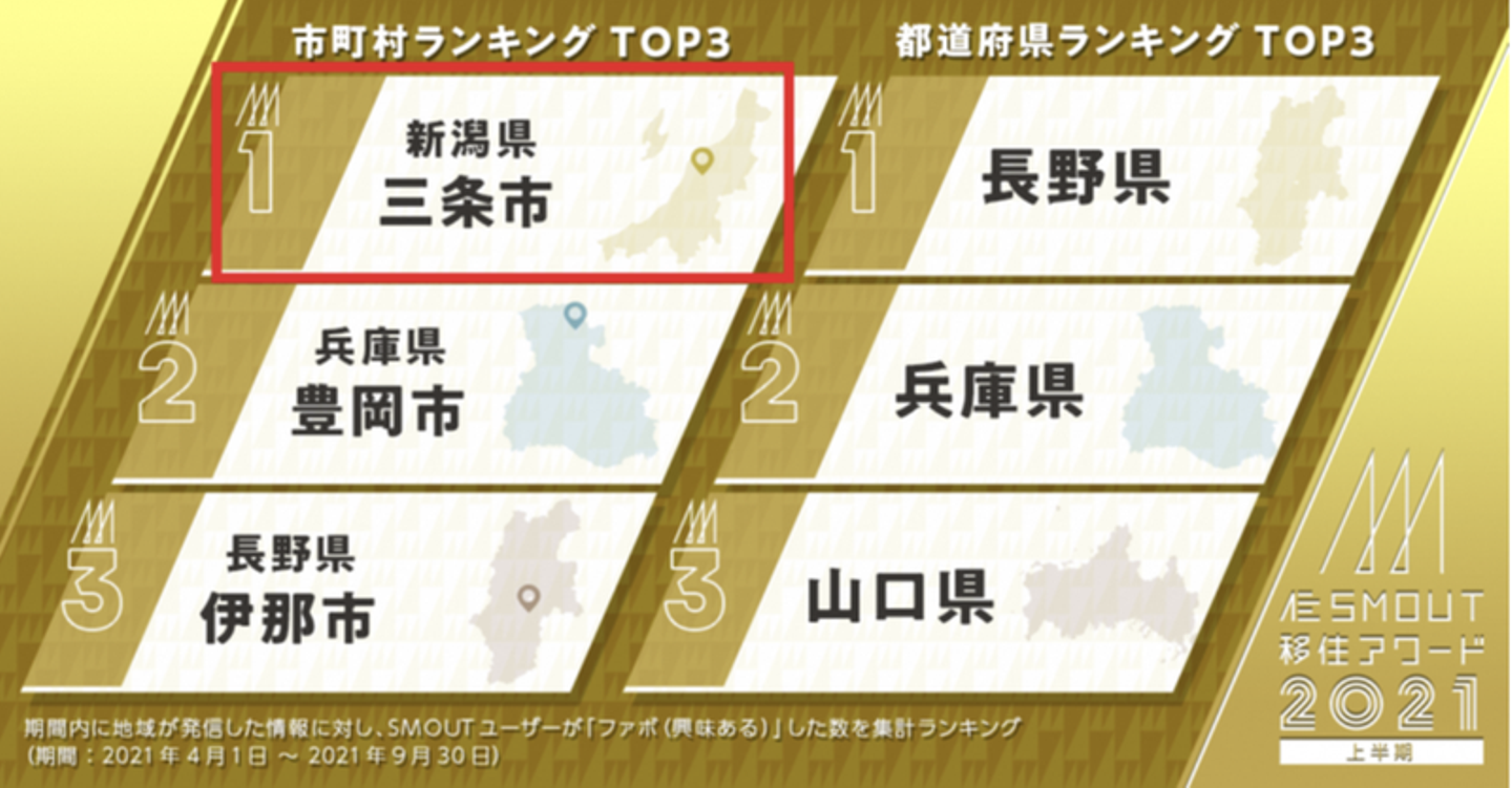 移住コンシェルジュ事業で主に情報発信媒体として活用している、三条市が『SMOUT移住アワード2021 上半期』にて、”1位”を受賞しました。