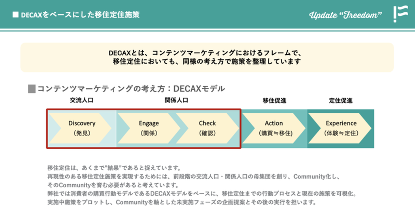 FoundingBaseでは、関係・移住人口を生むための戦略として、DECAXのモデルを基礎にした取り組みを展開しています。