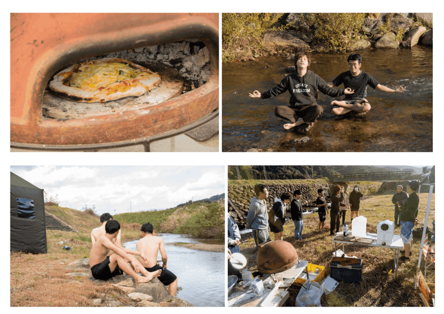 DIY後は、古民家の隣の里山の風景が広がる河川敷でテントサウナ&サウナ飯を実施。気持ちの良い秋晴れの中、川沿いに立てたテントサウナで整った後は川へダイブ!