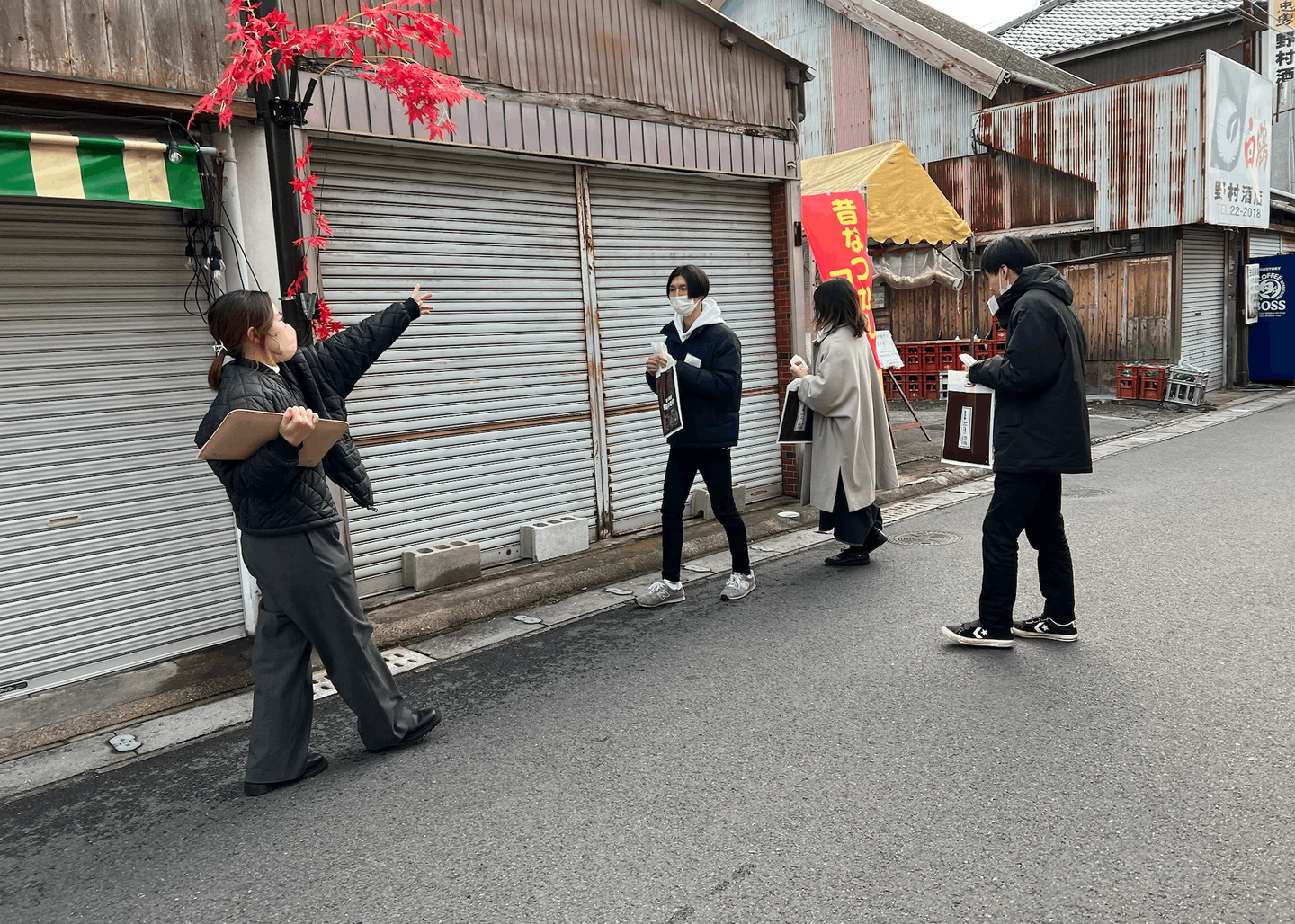移動の際には、昭和の町を散策しながら、みんなでコロッケを食べ歩きし、コミュニケーション