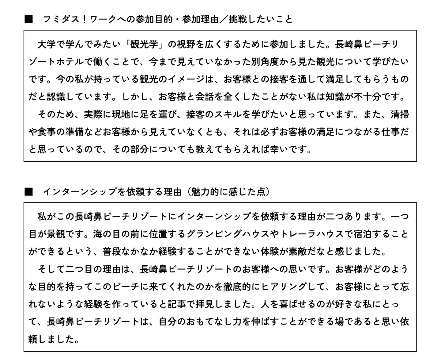 その際、「これまでの自分」「『フミダス!ワーク』に参加した理由」「インターンで学びたいことややりたいこと」などを書いたエントリーシートを作成して、提出しました。