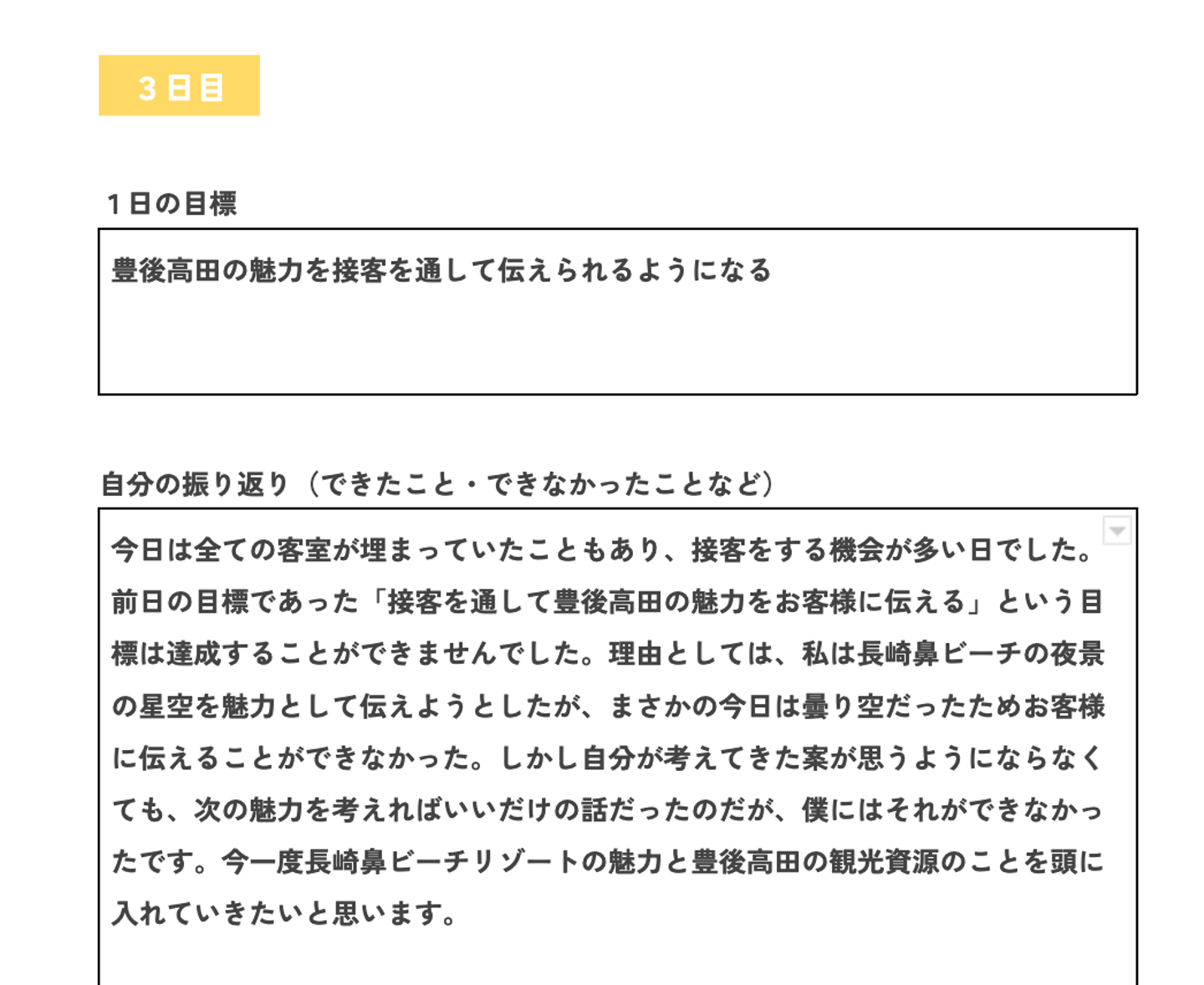 そうやって日々試行錯誤するために、生徒たちは毎日目標を設定して、インターン先の方々と振り返り面談を行って、日報でその日の学びと改善点を言葉にしました。