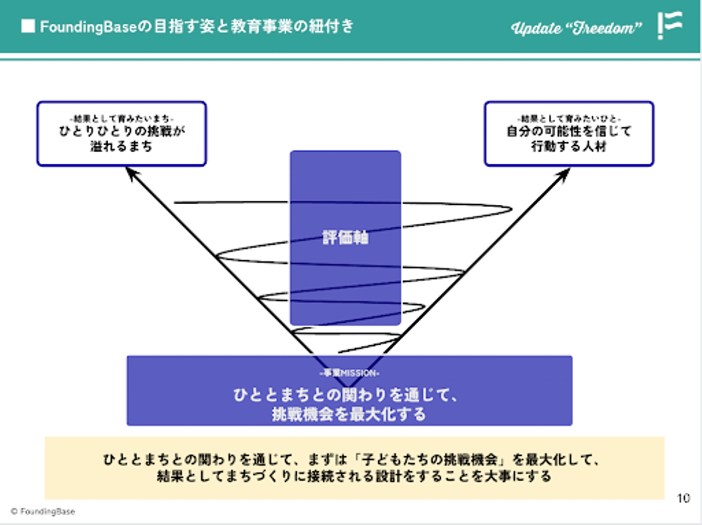 私たちFoundingBaseは、まちづくり会社としてエリア価値の向上を目指して、定住人口向けに教育事業を行っています。「ひととまちの関わりを通じて挑戦機会を最大化する」を事業MISSIONに掲げて、各地域で子どもたちの挑戦機会を創っています。