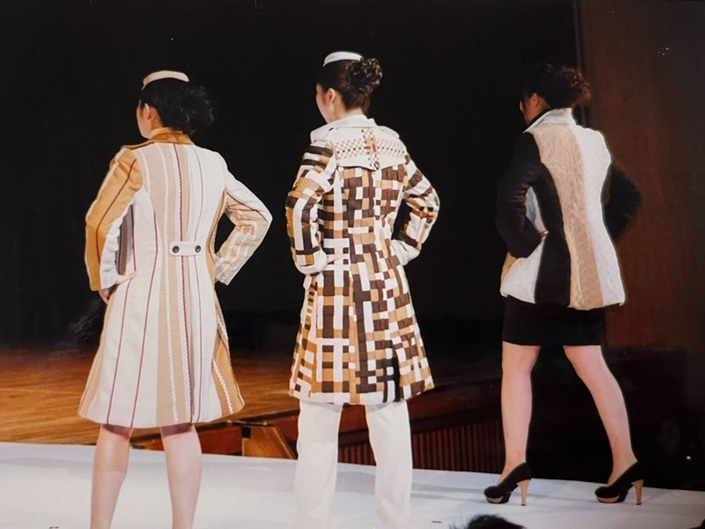 念願の服飾専門学校に入学。3年間ヌードカラー(世界平和)をテーマに服を作っていました。3年生の時にファッションショーの実行委員会をしていたのですが、その時に地元の中国新聞に世界平和を祈って服作りという題材で取材をされ、恥ずかしいような嬉しいような体験をしたことを鮮明に覚えています。