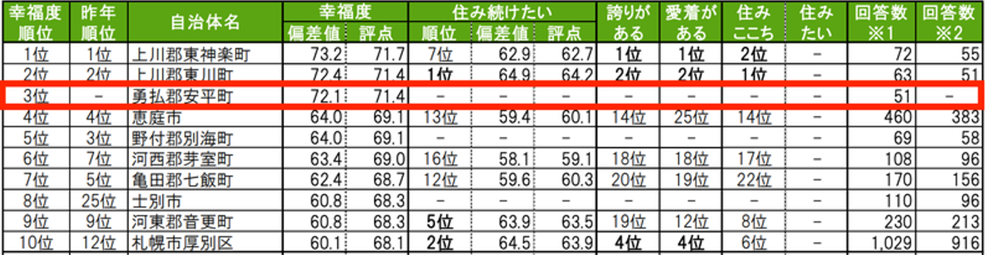 大東建託株式会社が行う、居住満足度調査【街の幸福度 自治体ランキング(北海道版)】にて、安平(あびら)町が見事3位にランクインしました!