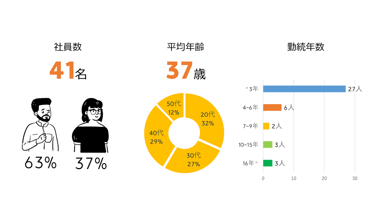 平均年齢は37歳ですが、5年ほど前から継続して新卒採用行っているため、20代のエンジニアメンバーが多く在籍しています。