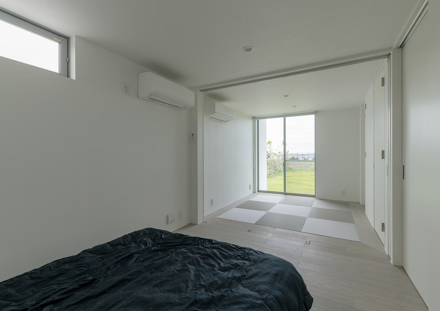大開口を設けたリビングからだけでなく、畳の客間からも海が見えるように計画しているんですが、この客間は、引き戸を開ければ寝室と繋げることが出来ます。