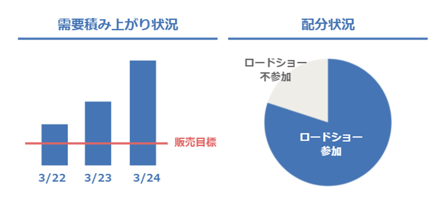証券会社と納得するまで話し合った甲斐もあり、実際にロードショーに参加した投資家を中心に需要が積み重なり、 初日にオファリング株数を確保することができ、アロケーションの80%以上をロードショーで面談した投資家に配分することが出来ました。