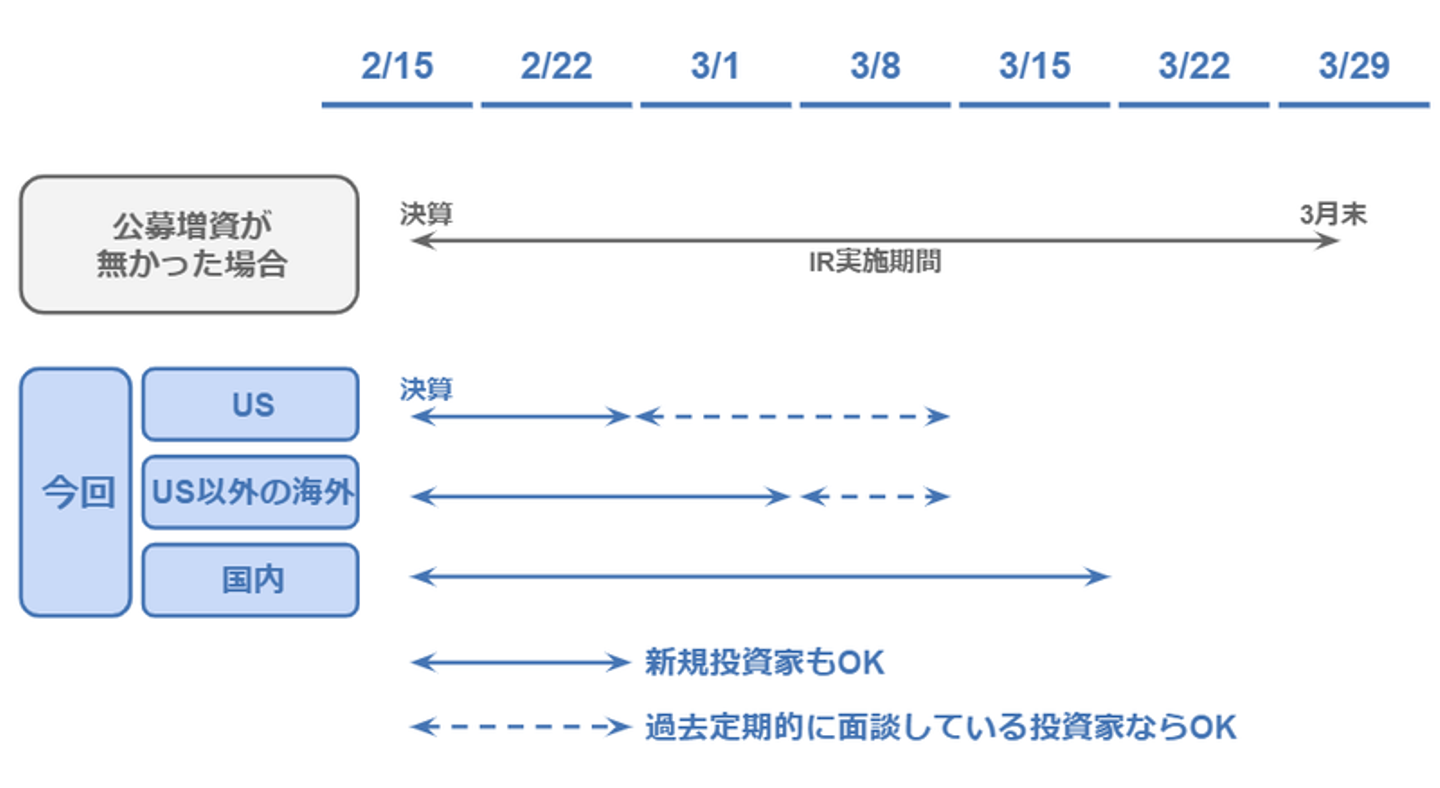 ただ、公募増資前の投資家面談は「事前勧誘にあたる虞」があり、公募増資前の面談は原則制限されます。一方で、毎四半期面談している投資家といきなり面談しないのは、却って不自然になる可能性もあるので、主幹事証券や弁護士と相談し、「新規投資家については、北米の投資家はローンチ2月末まで、US以外の投資家は3月5日まで可能。ただ、過去定期的に面談している投資家については3月12日まで可能」という整理にしました。