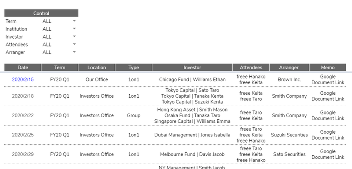 上述の通り、freeeでは各四半期で多くの機関投資家と面談しており、各面談について細かく記録しています。日時、参加担当者、弊社の出席者、ディスカッション内容等を記録しており、通常のIRにおいても、面談実績や前回話した内容を参照しながら、面談しております。