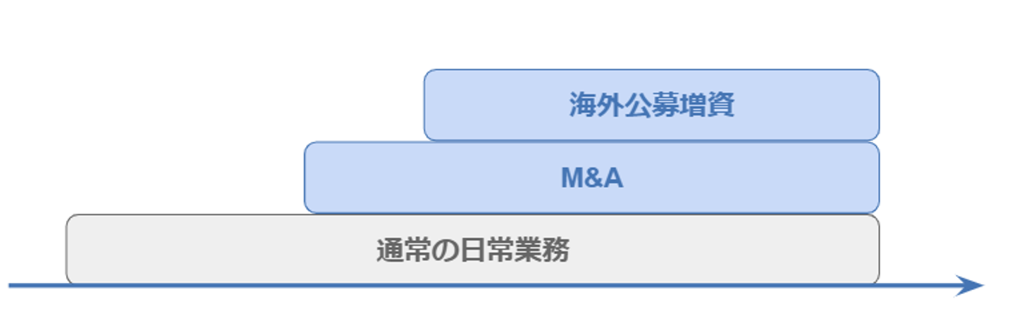 今回は海外公募だけですので、ビジネスDDと法務DDの2つだけになります。国内オファリングがある場合は引受審査が、IPOの場合は上場審査が加わります。
