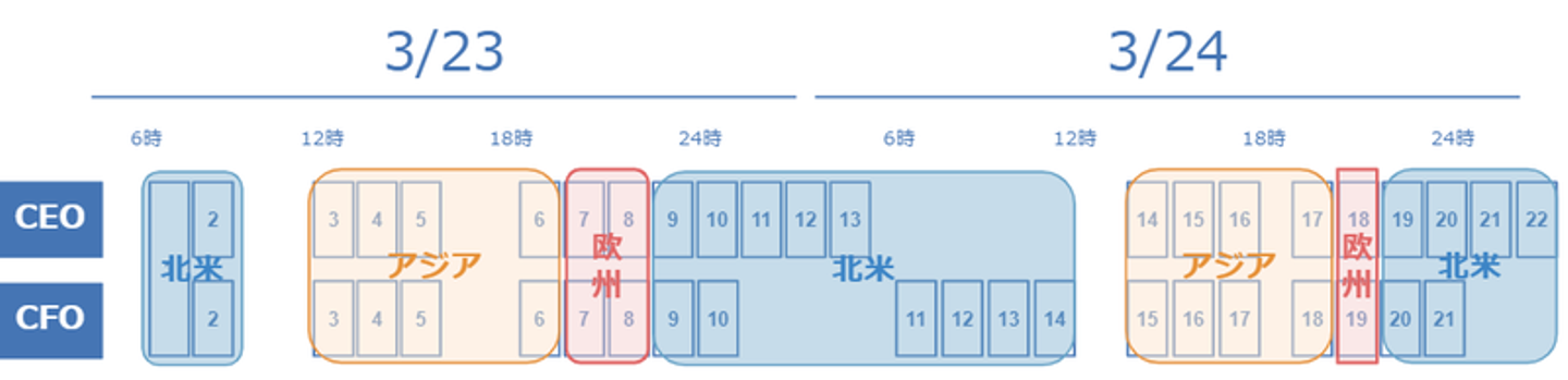 CEOは23日は深夜3時まで、一方でCFOチームは23日は早めの23時に切り上げて、翌朝早朝から面談することで、北米の投資家との面談を増やしました。