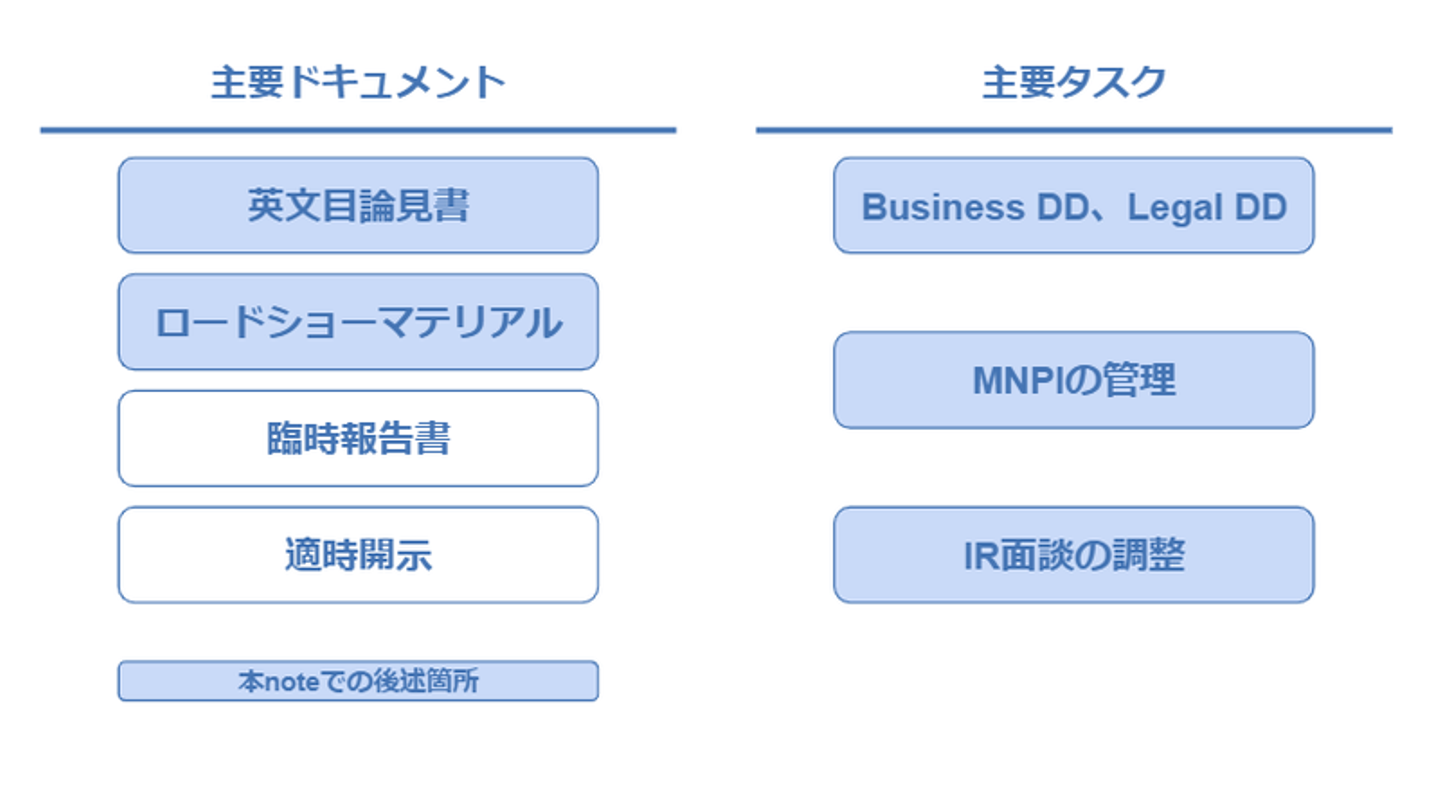 今回の海外公募増資における主なドキュメントとタスクは、大まかに整理すると下記の通りです。