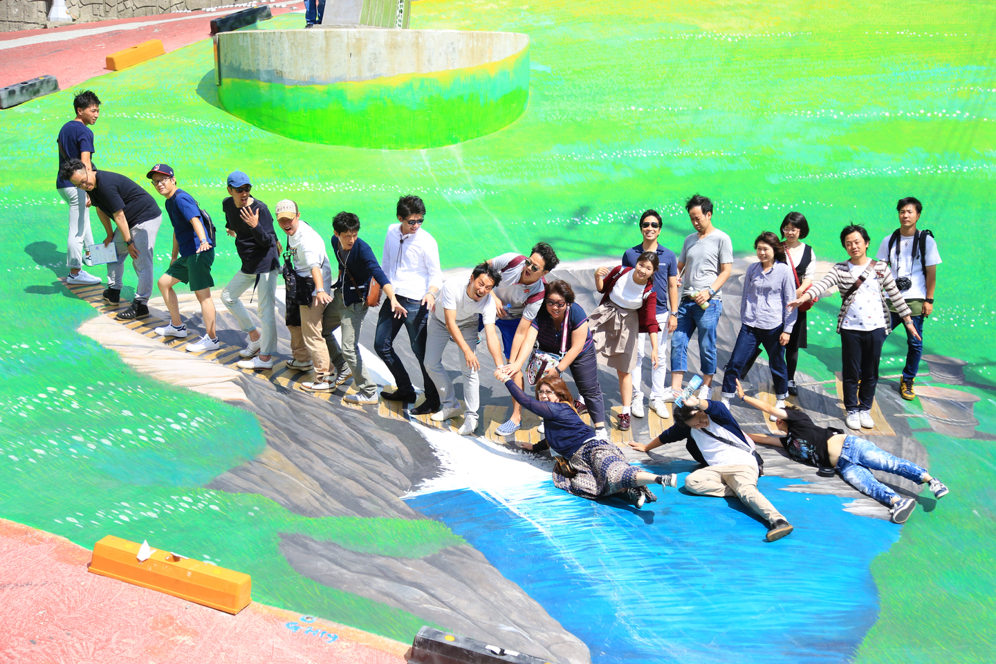 ヘアピンカーブの内側に描かれたトリックアートらしきもの。分かりづらいですが、谷につり橋がかかっている絵です。こんなトリックアート。メンバーが放っておくはずもなく、落ちる人を助けようとする写真が撮れました。