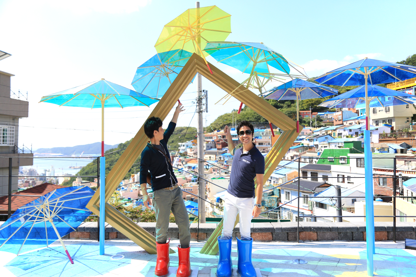 社長の阿久津と専務の田之上も仲良く記念撮影。微妙ですが可愛いらしい感じに撮れました。甘川洞文化村は、建築に携わるメンバーにとっては、新鮮で心揺さぶられた街となりました。