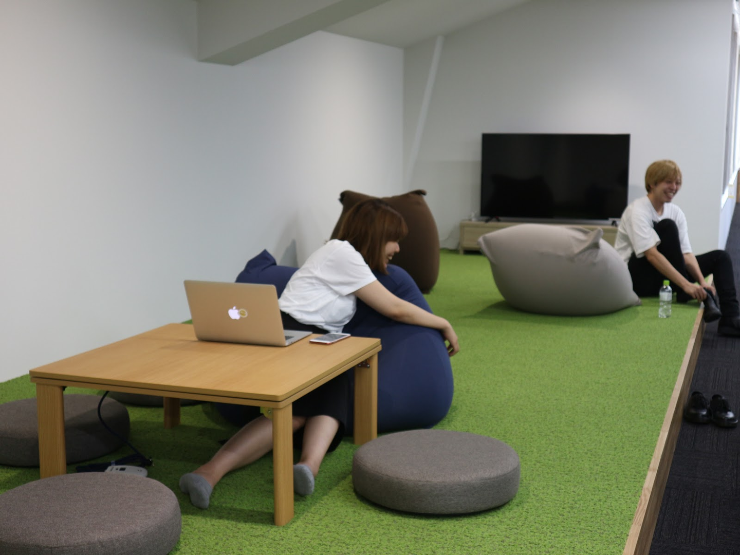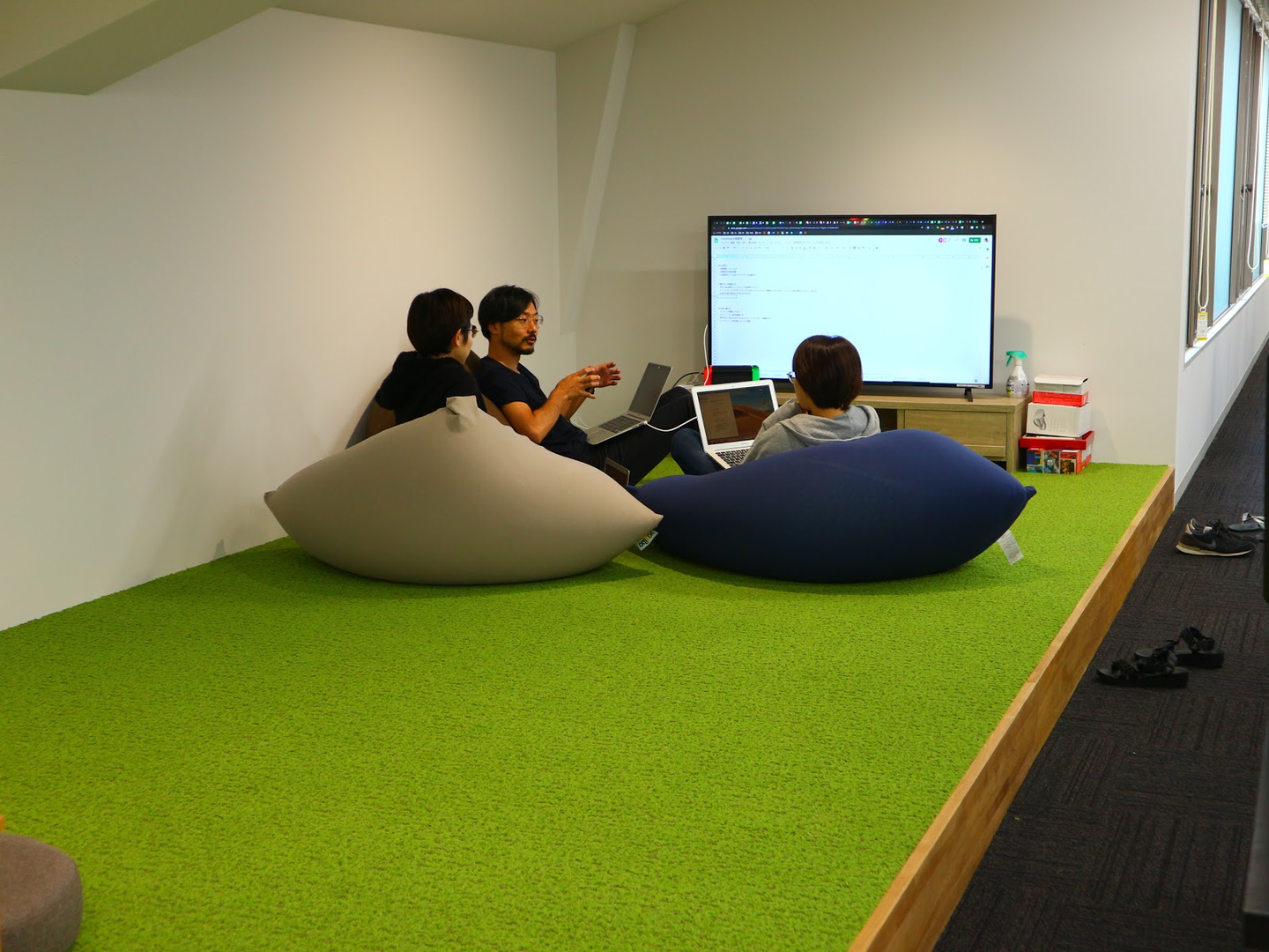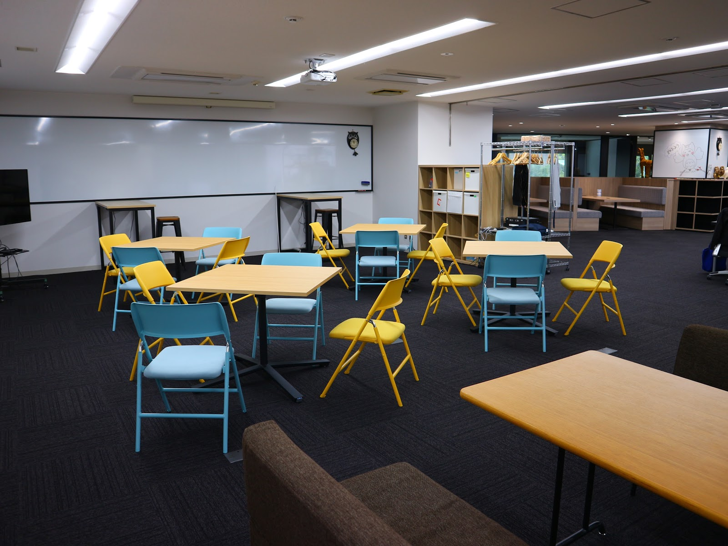新しく増えた休憩スペースの椅子は、水色と黄色の爽やかな配色でとても可愛いです。朝礼、夕礼、リリース報告会、月次報告会など全員が集まりやすくなりました。