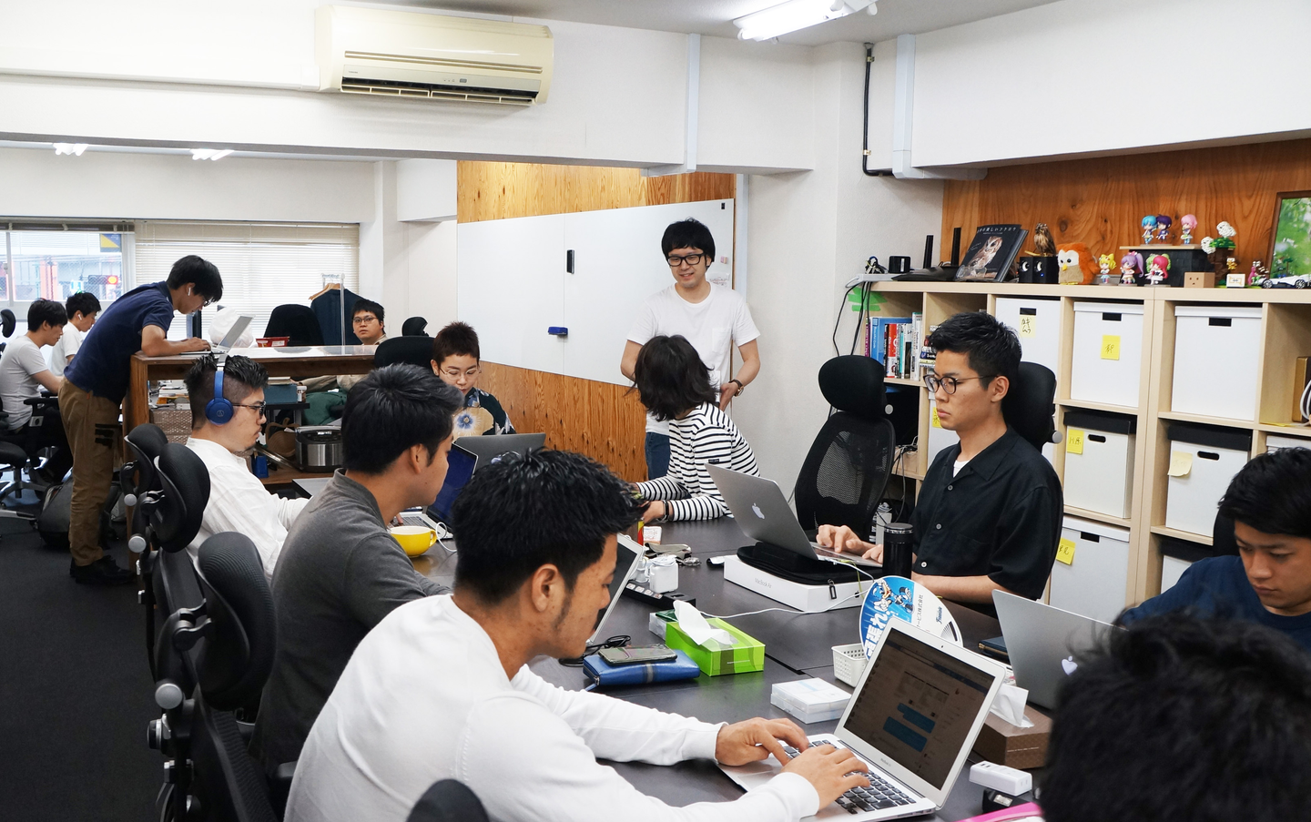 マンションの1室で、定員ギリギリの約25名が働いていました。下の写真は移転する直前の頃です。中央にスタンディングデスクがあり、手前が営業部、奥側にエンジニアチームが机を並べています。ギチギチですね・・