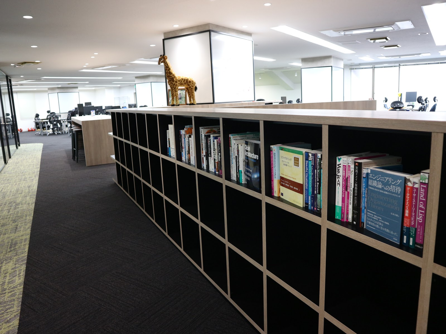 旧オフィスの2倍以上の広さになり、通路はとっても広々としています。本棚コーナーも新しくできました。