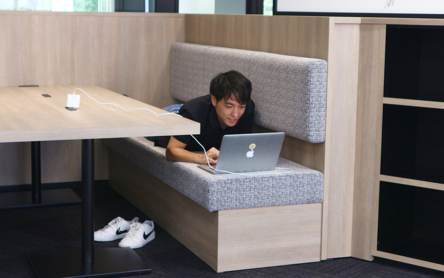 数日経って慣れてくると、寝っ転がって作業したり、スタンディングテーブルやソファへ移動して作業したりと、自分の席だけではなくて、自由に気に入った場所で仕事をするようになってきました。