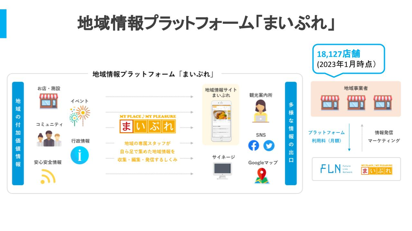 こうした地域情報を適切に発信していく手段として、FLNでは「地域情報プラットフォーム まいぷれ」を運営しています。収集した付加価値情報を、自社運営メディア「地域情報サイト まいぷれ」、各種SNS、デジタルサイネージ、観光案内所など、幅広い情報の出し口から発信しています。