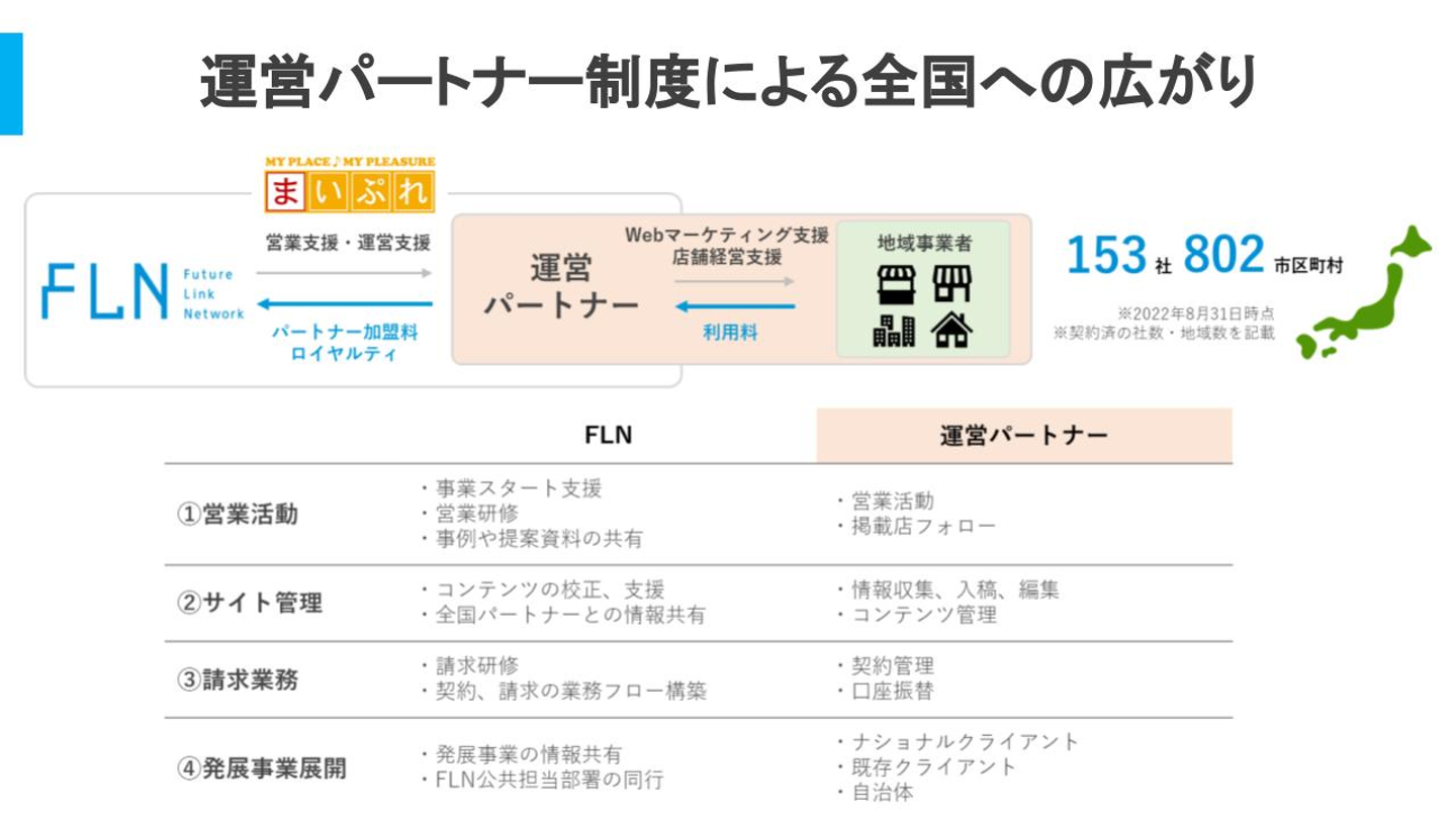 そのため、このプラットフォームを全国で広げ、発展させていく必要があります。本社が全国に支店を置いて運営するのではなく、各地の地元企業である「まいぷれ運営パートナー」がこのプラットフォームを運営しています。