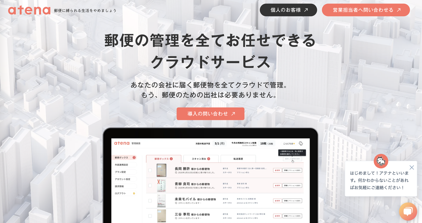 まだ申し込んだばかりで実際には設定しきっていないのですが、取引先に「次回からこの住所に送って(atenaさんから提供された住所を提示)」と伝え、次回から送ってもらえれば、atenaさんから郵便物をスキャンしてSlackなどで通知してくれるサービスのようです。