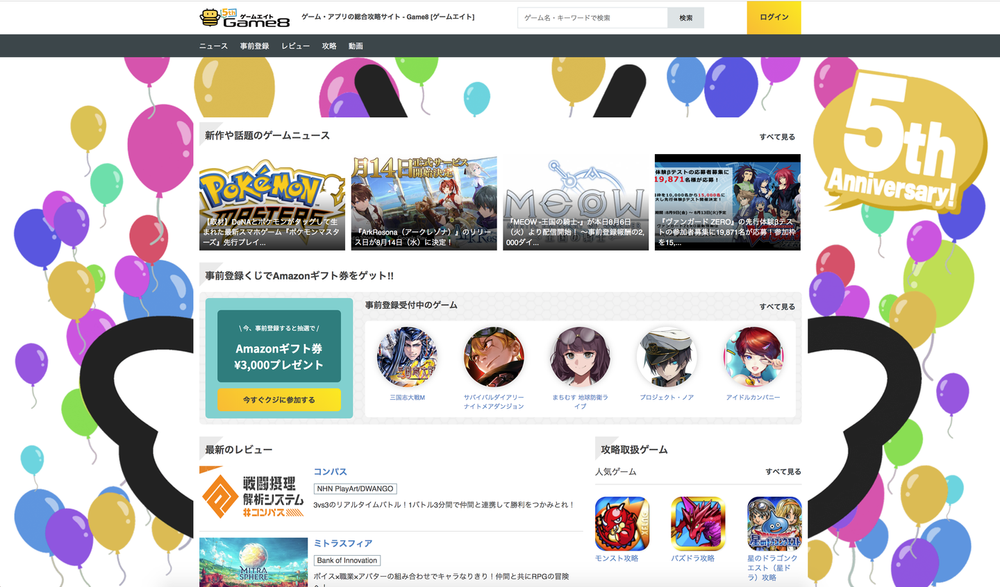本日、2019年8月8日、株式会社ゲームエイトが運営するゲーム総合情報サイト「game8.jp」が、開設5周年を迎えました!開設5周年を記念して、「game8.jp」のPC画面がアニバーサリースタイルになっています。今後もユーザーの皆様が更にゲームを楽しむために、様々なコンテンツを追加してまいります。