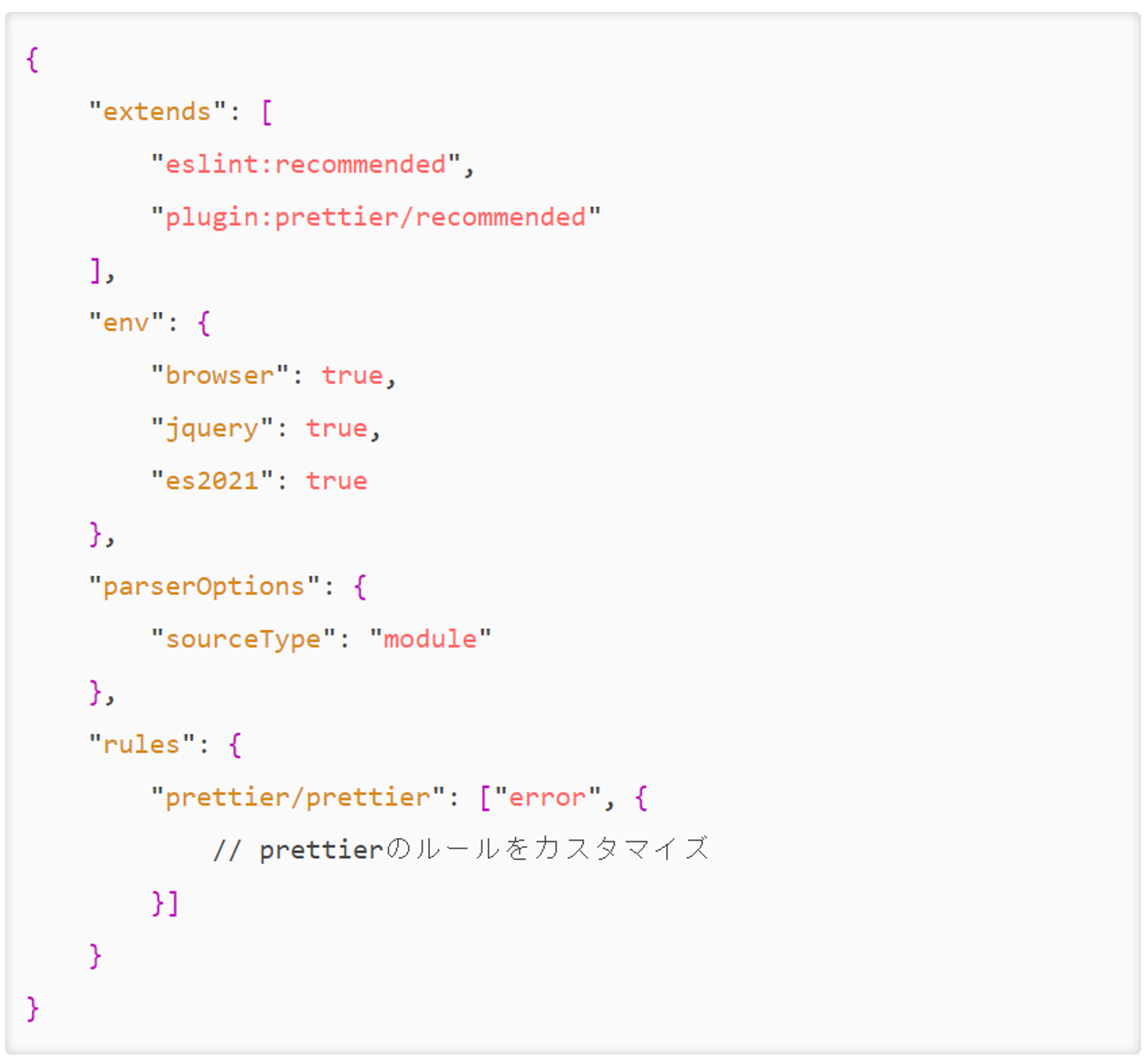 こういった Prettier とコンフリクトするルールについて、Prettier の設定で ESLint を上書きするようにするプラグインです。