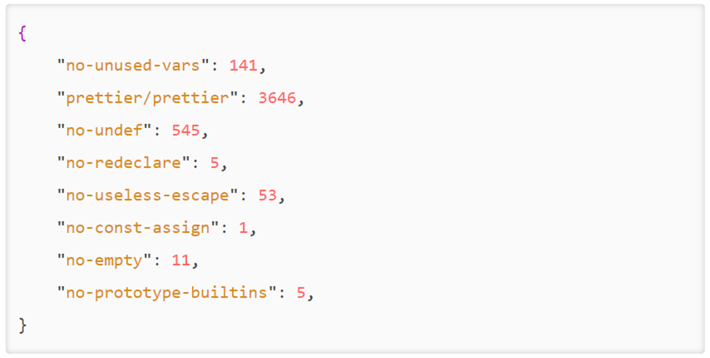 実行すると下記のように ESLint のルール別のエラー数が表示されます(下記は実際に図った数値で合計 4000 over のエラーが出ています!)