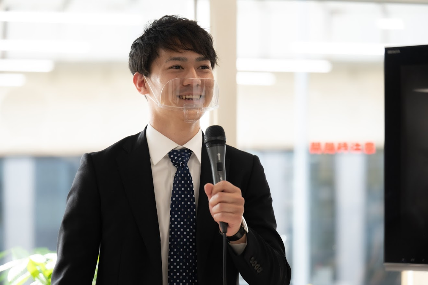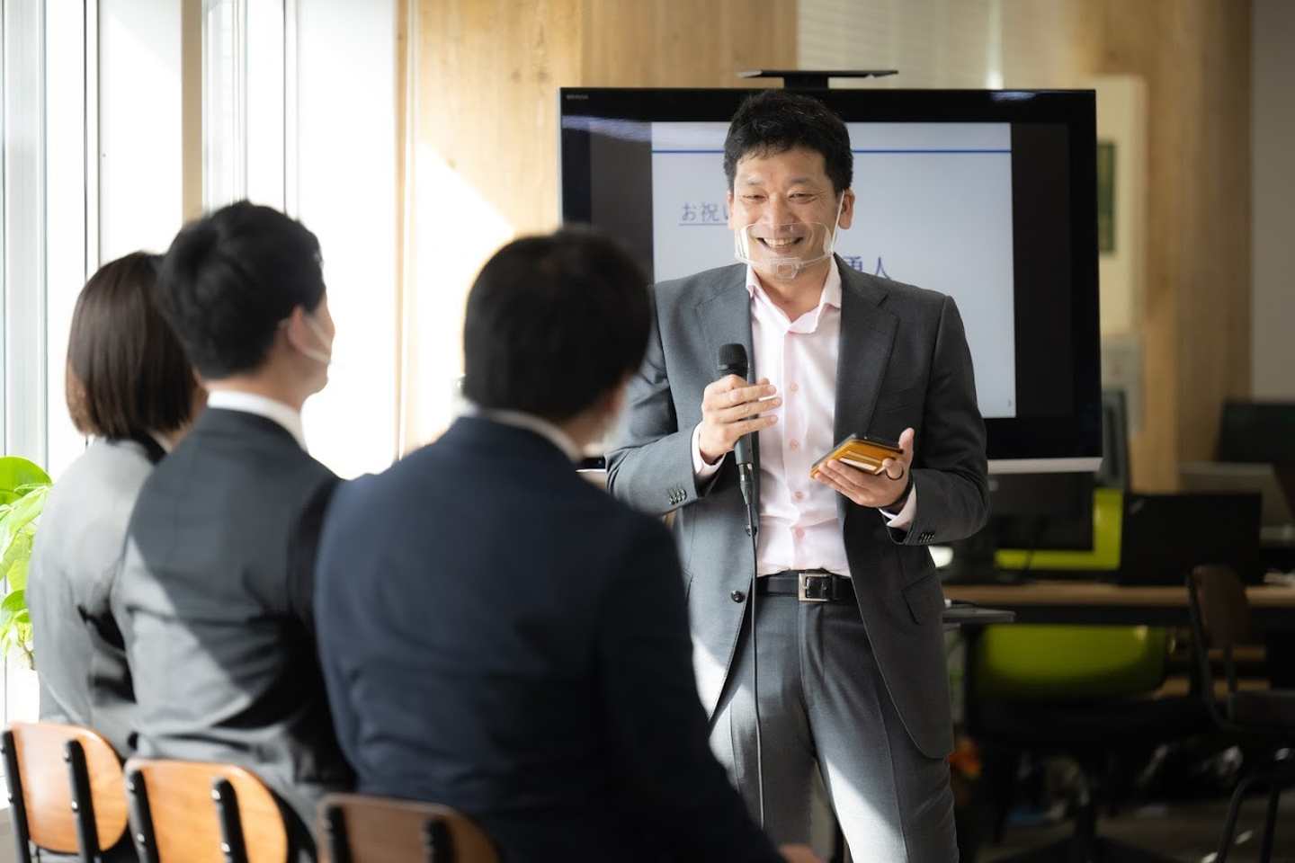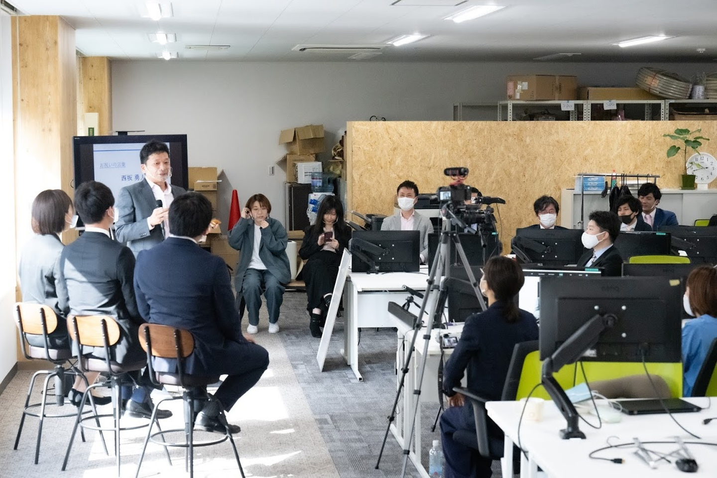 入社式は感染症防止対策の一環として、オンラインとオフラインを組み合わせた形式で開催。出社しないメンバーも参加出来るよう、ライブ動画でも配信されました。