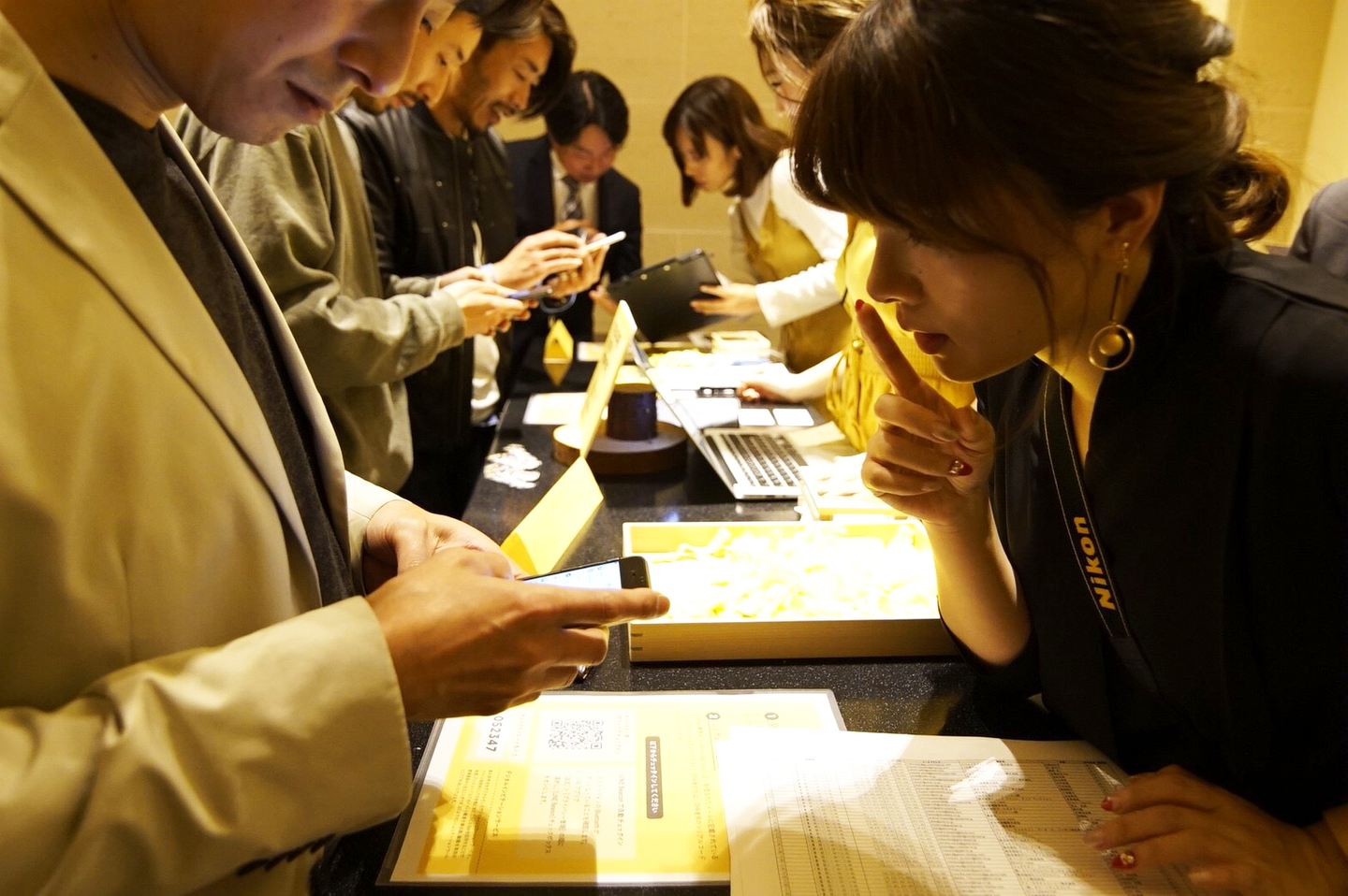 ゲストの皆さんが受付でスマホを提示しています。これが今回ローンチされた新サービスの一つ、デジタルインビテーションサービス「WeCALL(ウィーコール)」です。