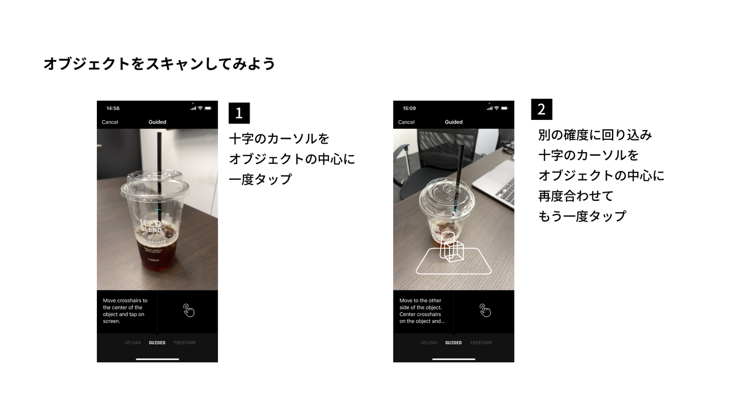 今回は小物を撮影するのでGUIDEDで撮影していきます。 まず撮影したいオブジェクトの範囲を決めます。 このあとオブジェクトの周りを360度回りながら撮影するため、 一度置いたオブジェクトは撮影場所には注意しましょう。 あまり低い場所に配置すると中腰の時間が長く腰を痛める恐れがあるので ある程度の高さがある場所に配置するようにしておきます。 コツを掴むまではなかなか撮影がうまくいかないため、動きやすい服装が 適していると思います。皆さんかなり奮闘して撮影しておりました。