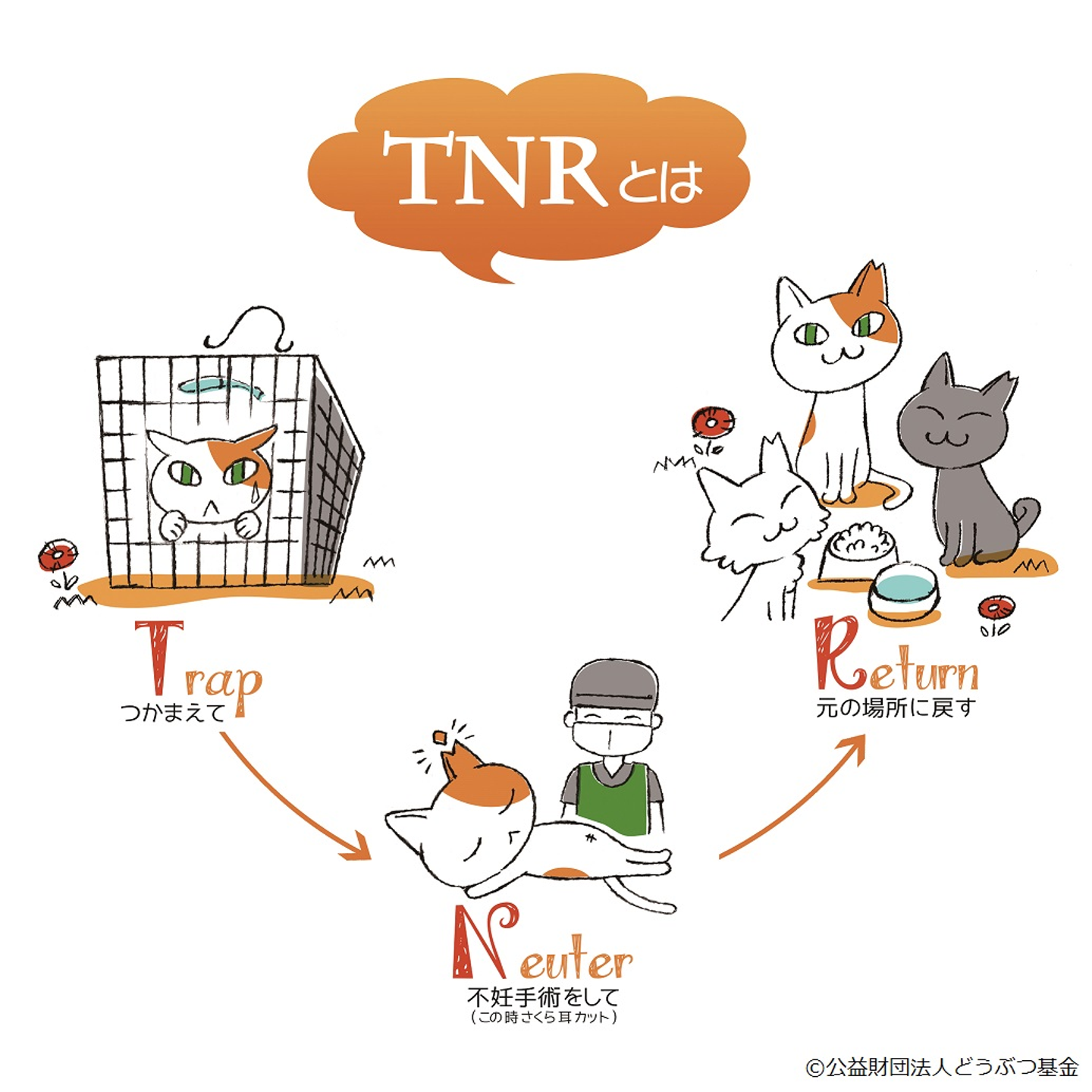 ※2:Trap(捕まえる)、Neuter(不妊去勢手術)、Return(元の場所に戻す)の略で、“飼い主のいない猫”の繁殖を防ぐ方法。猫たちは地域住民からご飯をもらいながら「地域猫」として一代限りの命を全うします。