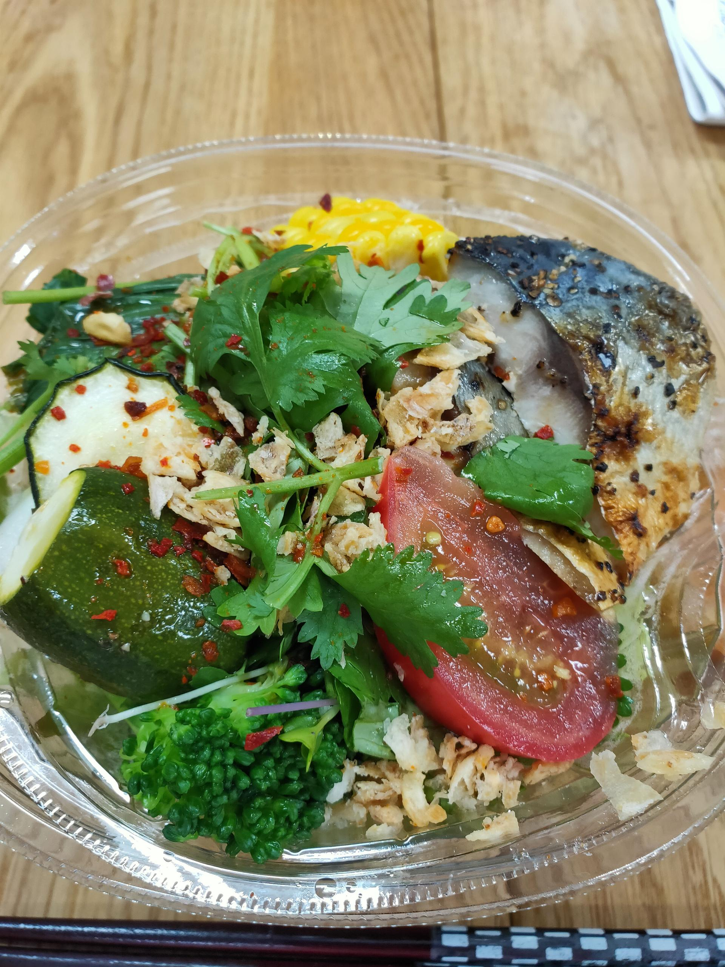 1.5日分くらいの野菜が入っているパワーサラダ。野菜は新鮮でハリがあり、上物(写真は鯖。他に鶏むね肉やアボカドなど)もいい具合に調理されています。「前夜は焼肉、今夜は中華」といった日に食べると食生活のバランスを保て、心の平安を得られます。おいしいサラダが近くで買えてありがたいです。