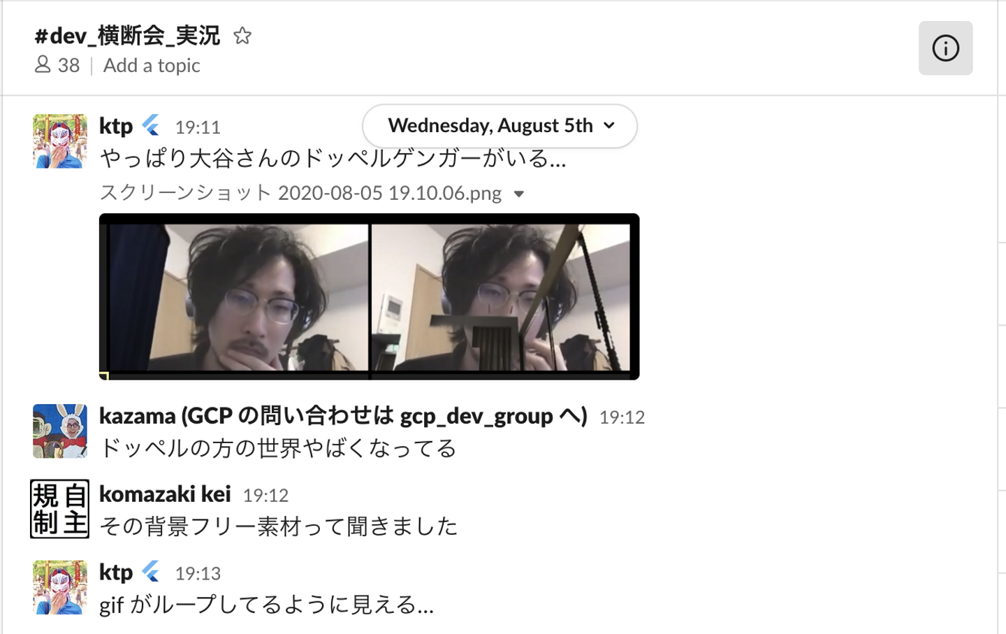 中には自分が頷いている gif を作ってバーチャル背景にしてる人がいて、途中からその背景をパクって設定する人が出たりとカオスな状況になりましたw(背景を作った当の本人はフェードアウトしていて背景がただ頷いているだけにw 本当に話を聞いてるのかわからなかったんですが、slack への実況投下はあったのでちゃんと聞いてたっぽい笑)。