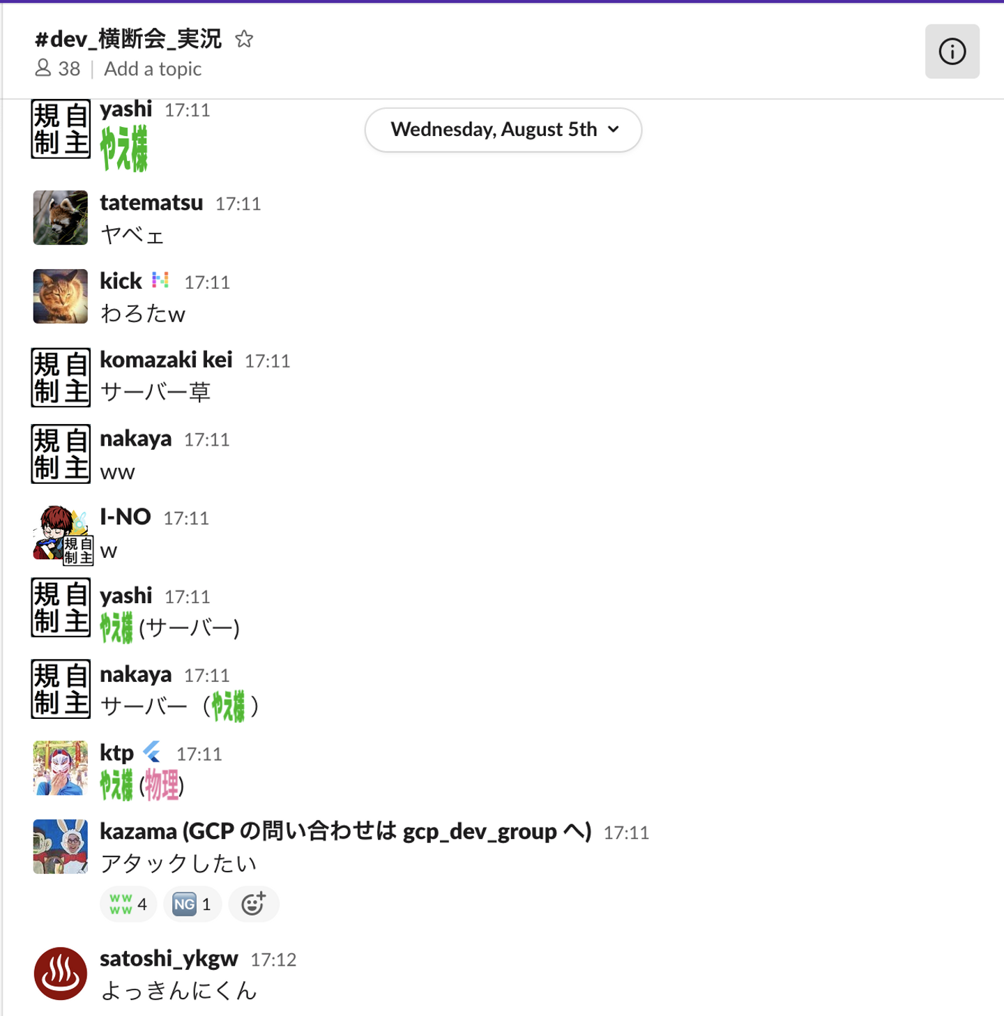 盛り上げる工夫としては、slack に横断会の実況チャンネルを作って、そこで自由に意見を言ってもらうようにしました。