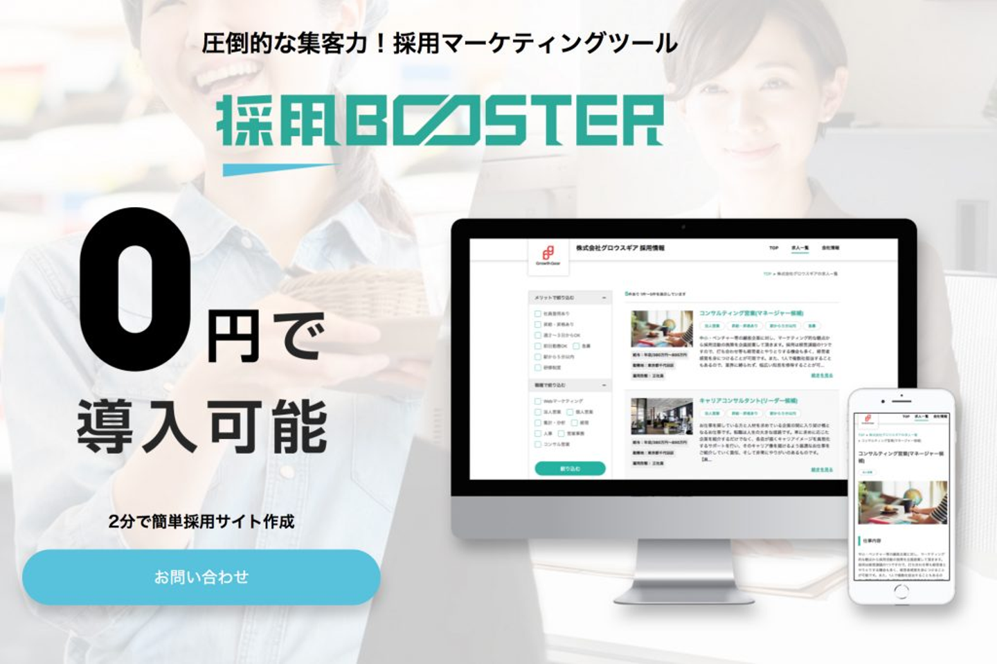 『採用BOOSTER』は、2分でUIに優れた採用サイトをかんたんに構築、運用できる採用マーケティングツール。求人検索エンジン『Indeed』とも簡単に連携でき、採用活動を加速させることができます。