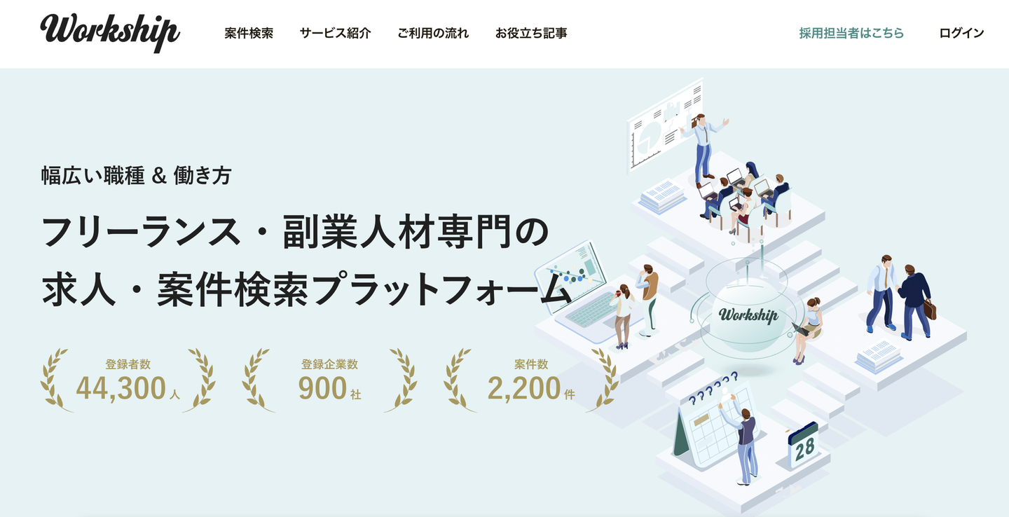 2つ目のスキルシェア事業では、DX領域におけるフリーランス・副業向けマッチングサービス『Workship』を展開しています。デザイナー、エンジニア、マーケター、編集者、人事、広報など、さまざまなスキルを持ったフリーランス・副業人材と、そういったプロフェッショナルの力を借りたい企業を繋ぐマッチングサービスです。