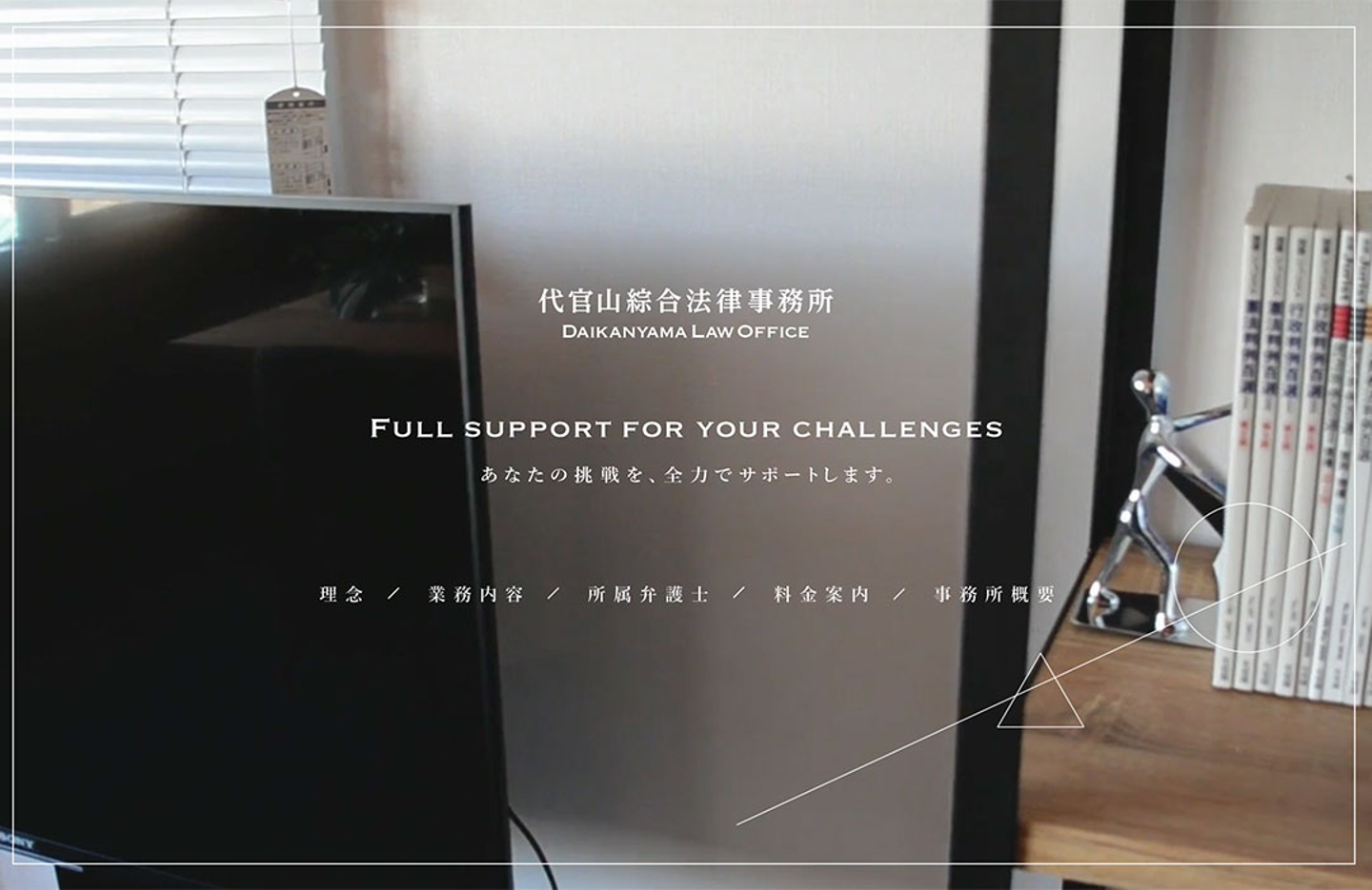 経験豊富な実績を持ちつつ、スタートアップ業界にも強い代官山綜合法律事務所。かたすぎず、それでいて洗練された演出を心がけ、ロゴデザイン、映像、撮影など、細部までデザインをさせていただきました。(わたしはファーストビューの右側で揺れている幾何学が異様に好きです)
