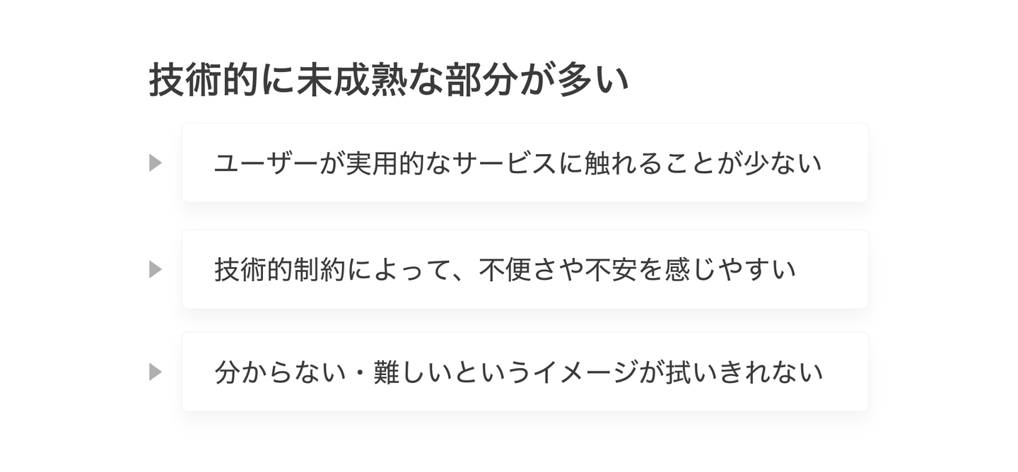 そのため、ブロックチェーンを用いた実用的なサービスはほとんど現れていません。同時に、身近なユーザー体験に乏しいからこそ、分からない・難しそうというイメージを持っている人もまだ多いという実情があります。また、技術的制約によって、ユーザーが不便さや不安感を感じるシーンが発生しやすいことも解決すべき課題です。