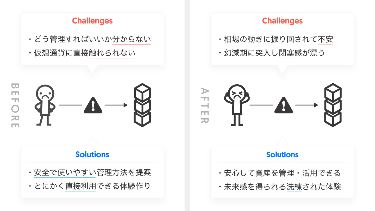 そこから、いくつかのハッキング事件や相場の下落を受け、いまユーザーを取り巻く課題は変化しています。仮想通貨の認知は大きく広がり、様々なユーザーが実際に仮想通貨を購入し、保有していく中で、いま課題なのは多くのユーザーが感じている「不安」や「閉塞感」です。