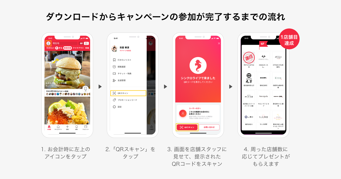 【参加条件】 対象飲食店で税込1,000円以上のお会計の際にシンクロライフのアプリで指定QRコードを読み取る